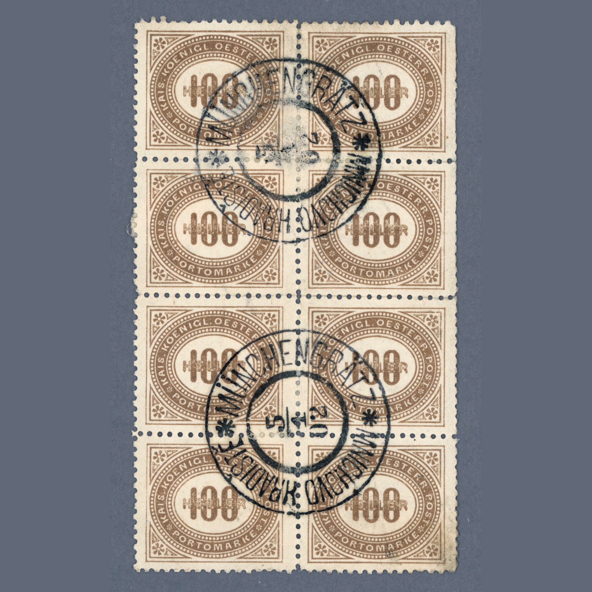 1899/1900 Ausztria – pecsételt 100 helleres portó bélyeg nyolcastömbben (8 Korona porto!) – ritka nagy összefüggés