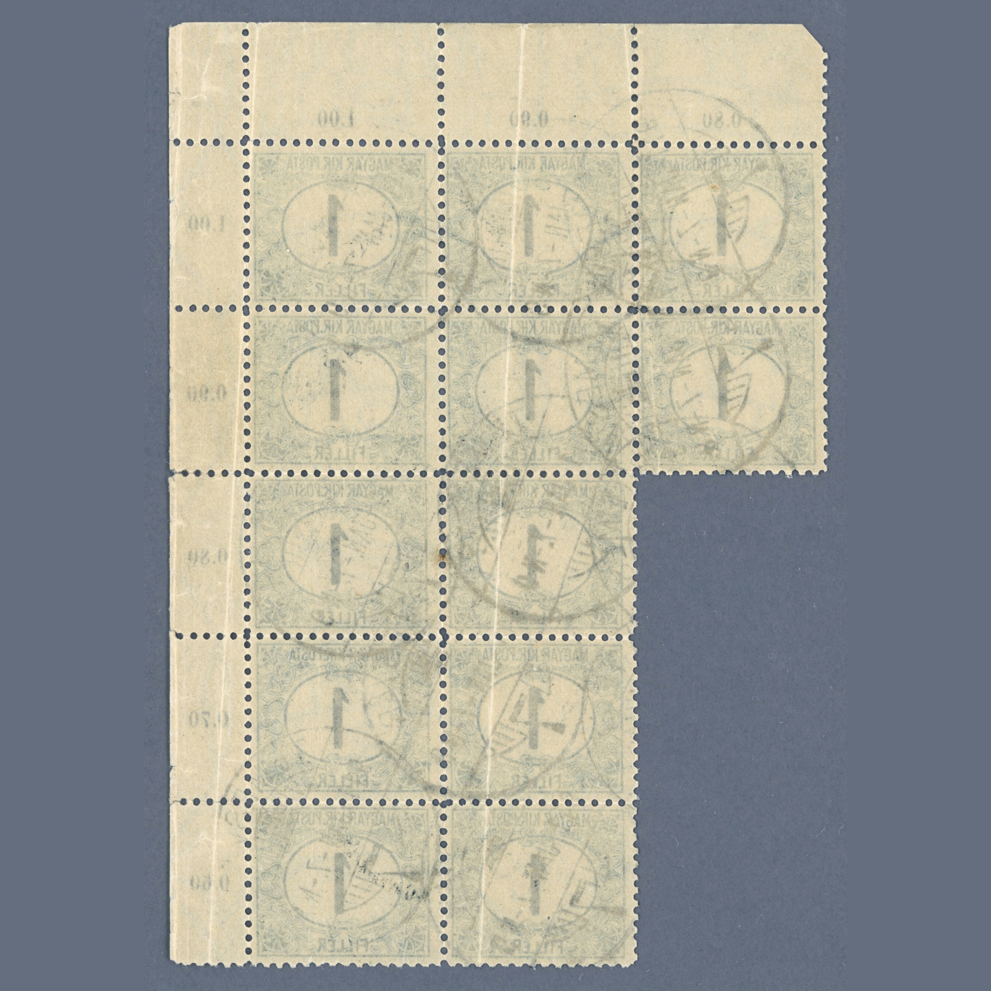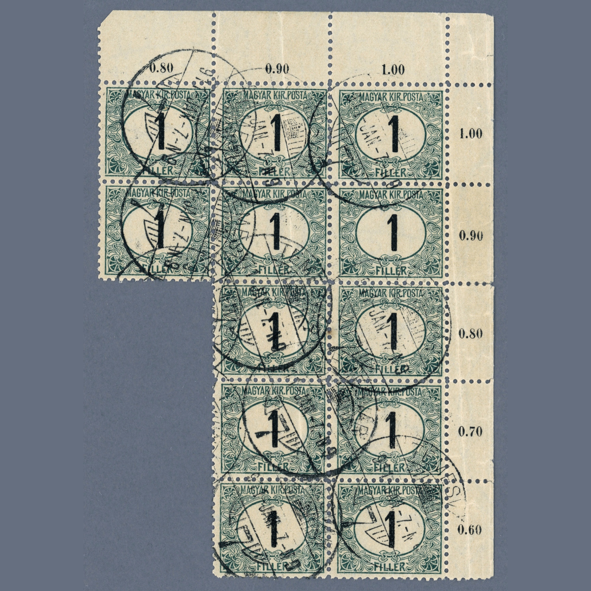 1903 Magyarország – Portó 1 fillér pecsételt tizenötös tömb, B fog (11,5 fogazat), az egyik bélyegen csillagvízjel – ritkán látható ilyen nagy pecsételt összefüggés | Phu: 40+++ EUR