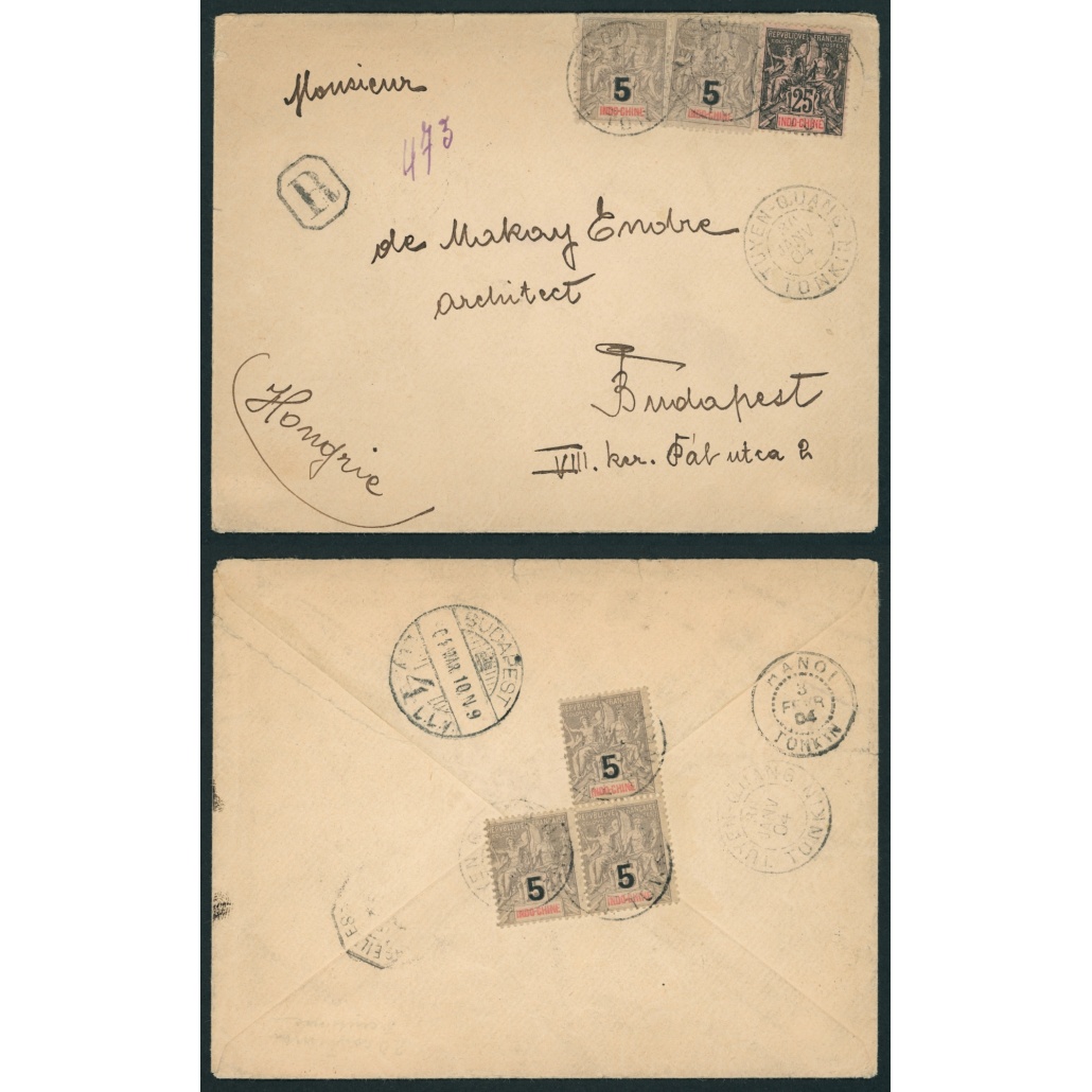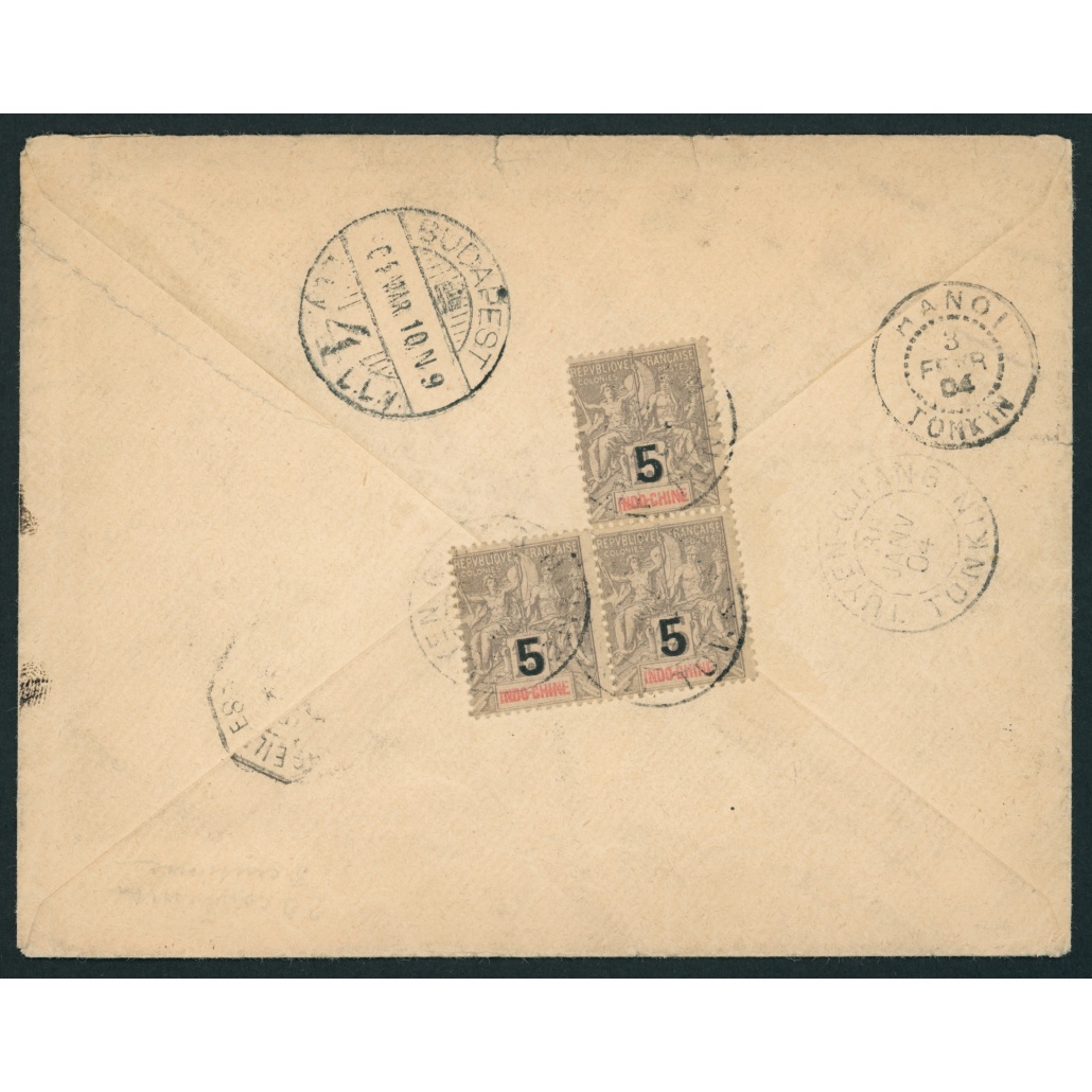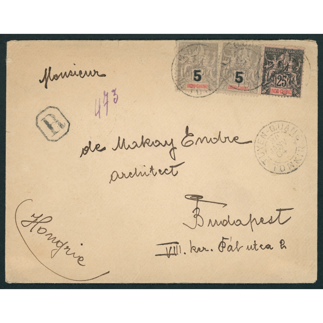 1904 Indokína – Budapestre küldött ajánlott levél 6 bélyeges díjlerovással – ritka destináció