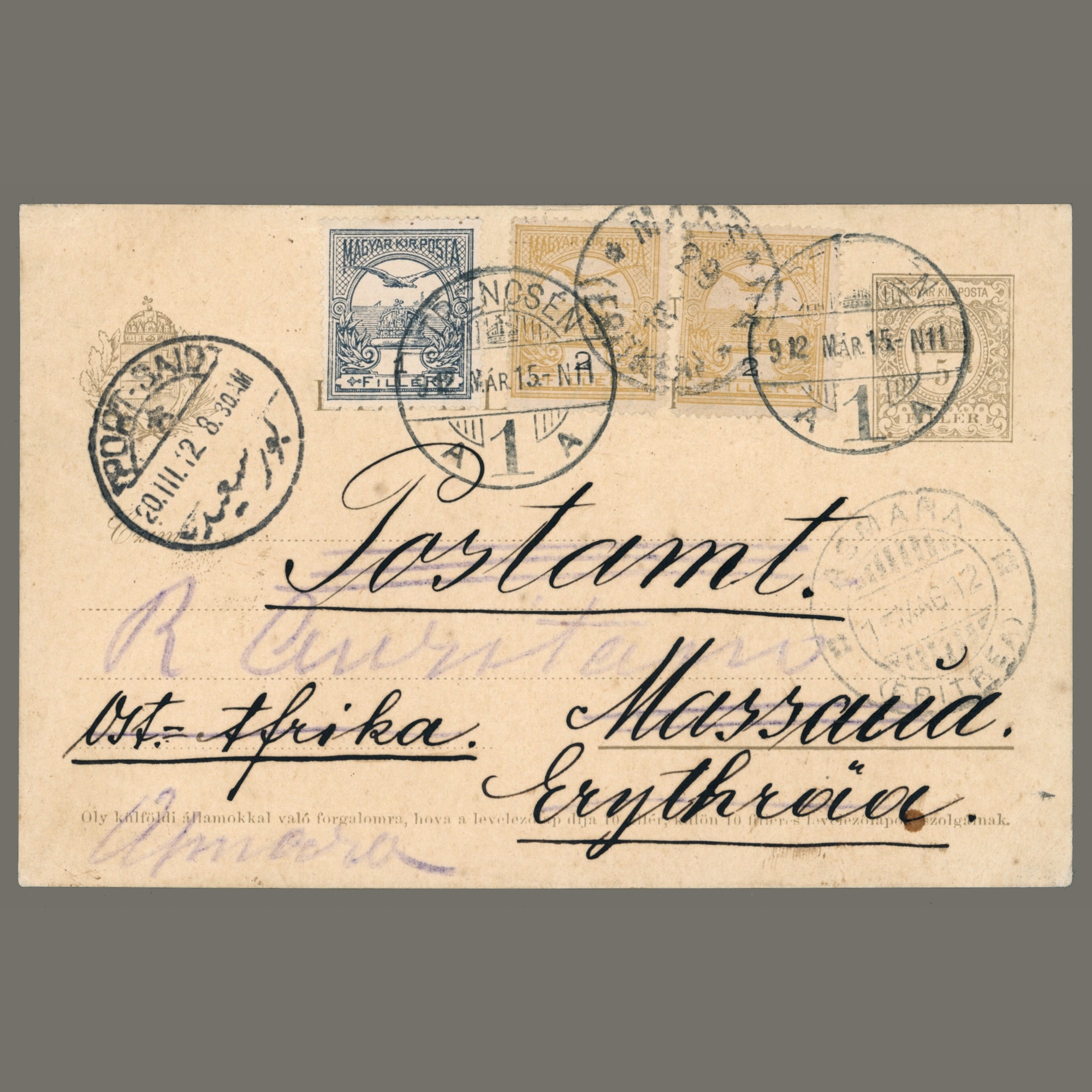 1912 Magyarország – díjjegyes levelezőlap díjkiegészítve Trencsénről Eritreába küldve – rendkívül ritka destináció