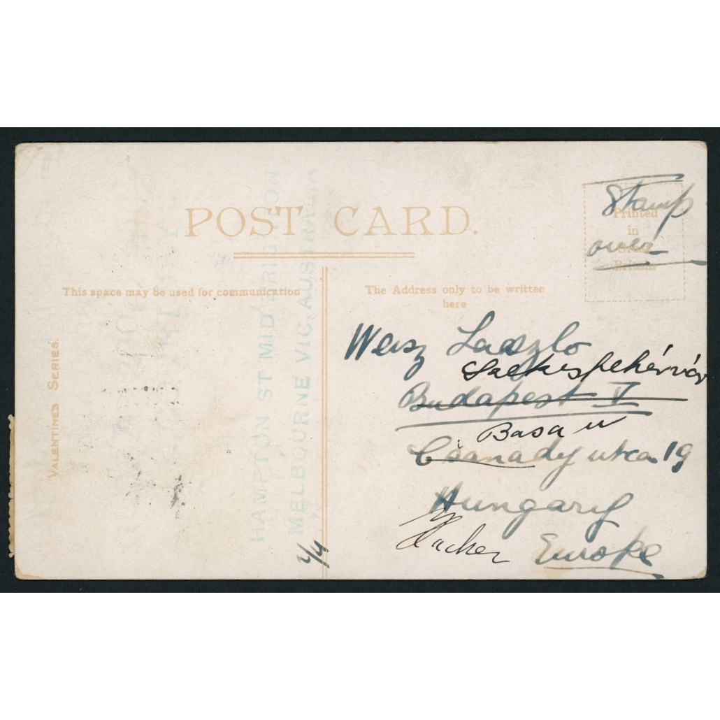 1913 Ausztrália – TCV képeslap Magyarországra küldve – szélső bélyeg fogazata sérült – ritka destináció