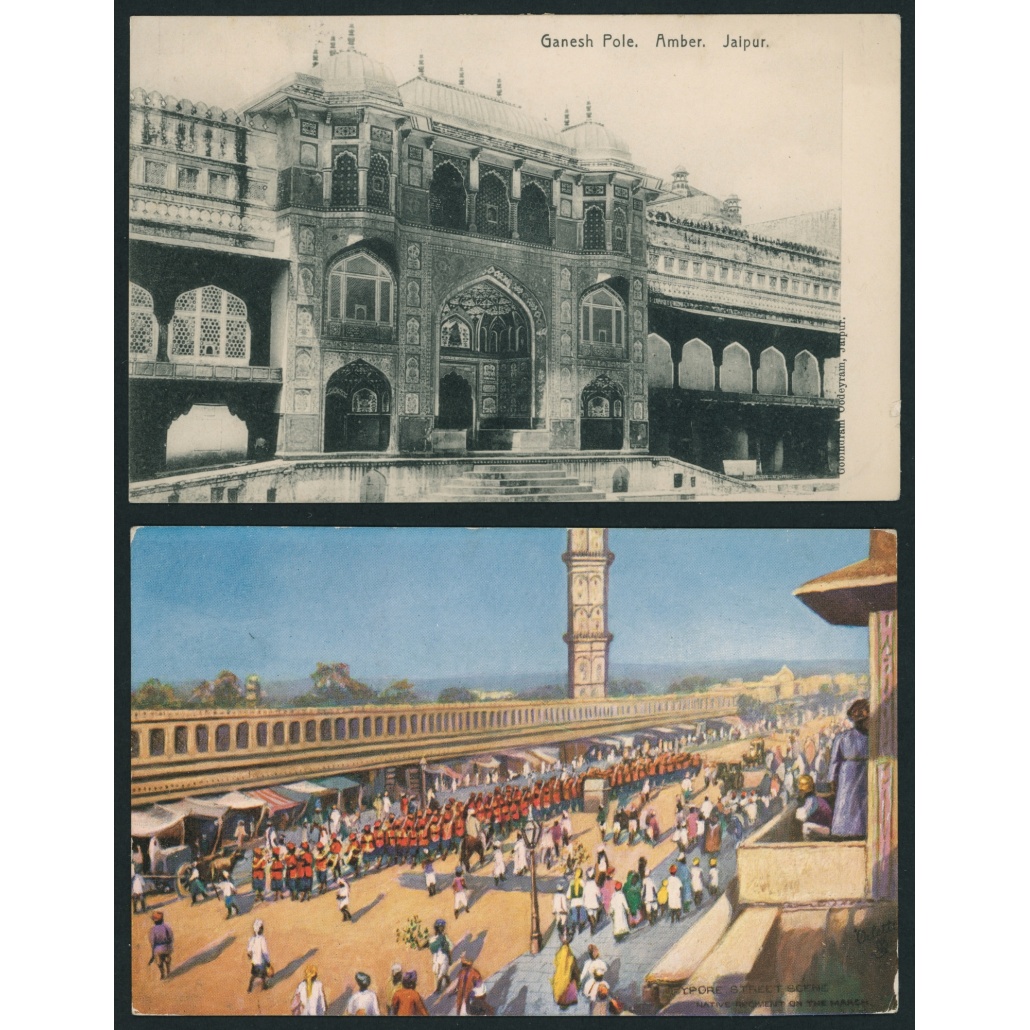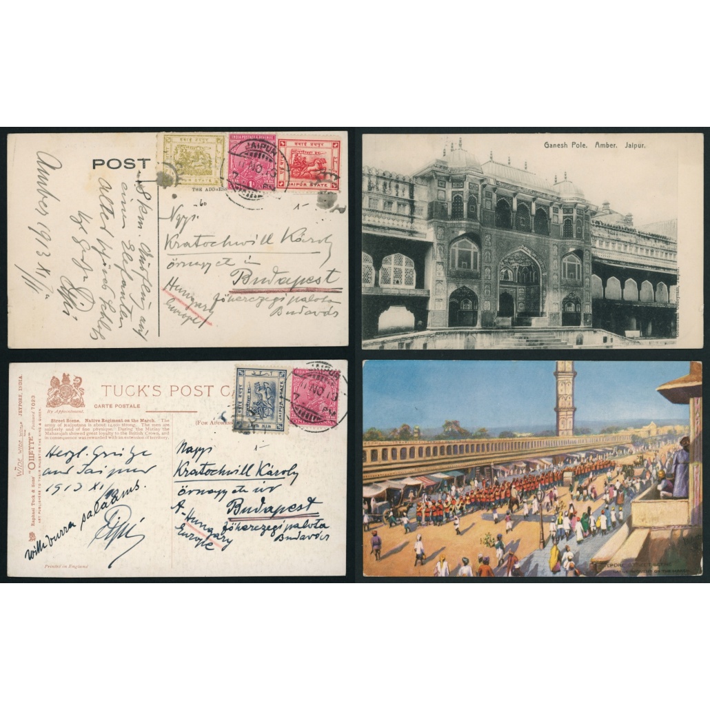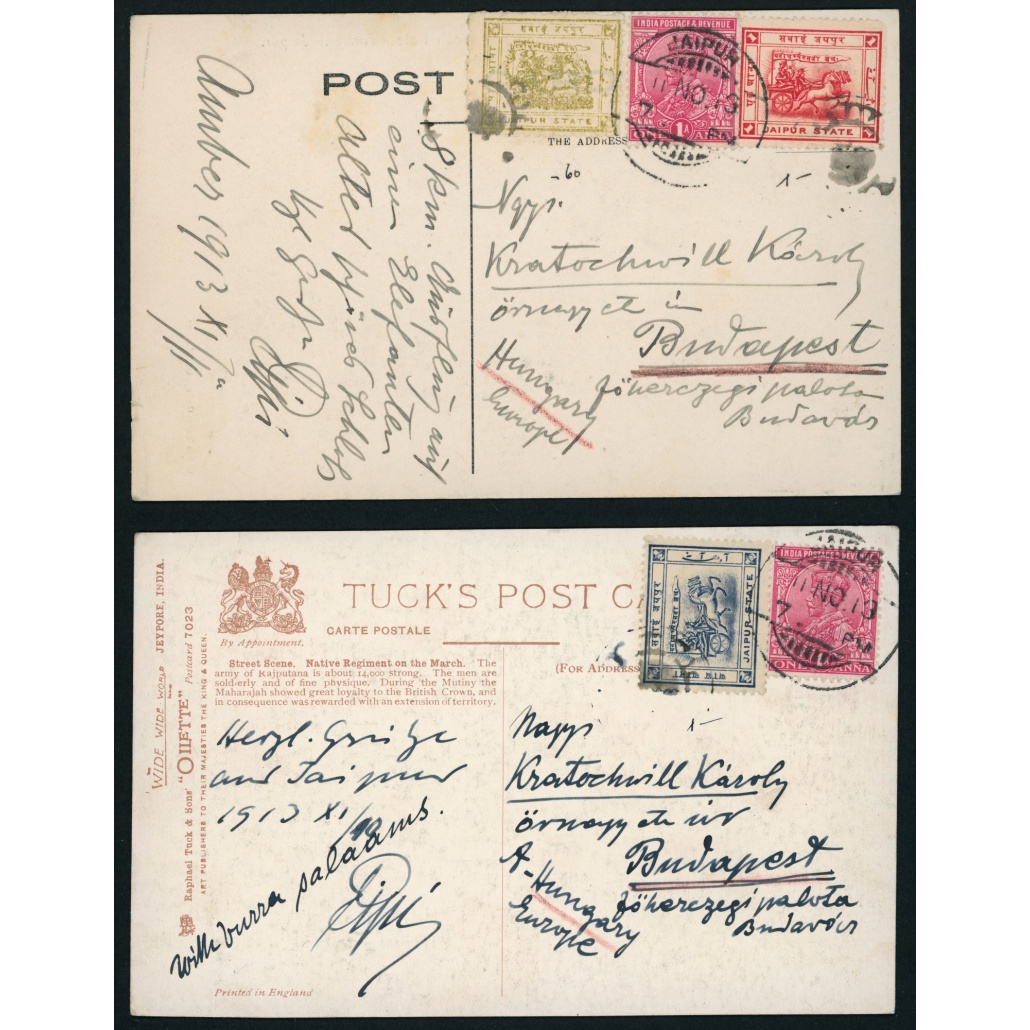 1913 India – Magyarországra küldött 2 db képeslap Jaipur helyi bélyeggel + indiai bélyeggel bérmentesítve Kratochwill Károlynak címezve világkörüli utazásról