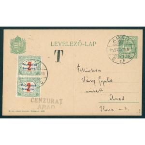 1919 Arad – díjjegyes levelezési lap Aradon feladva, a 2 f díjhiány miatt 4f portóval | Attest: Bodor
