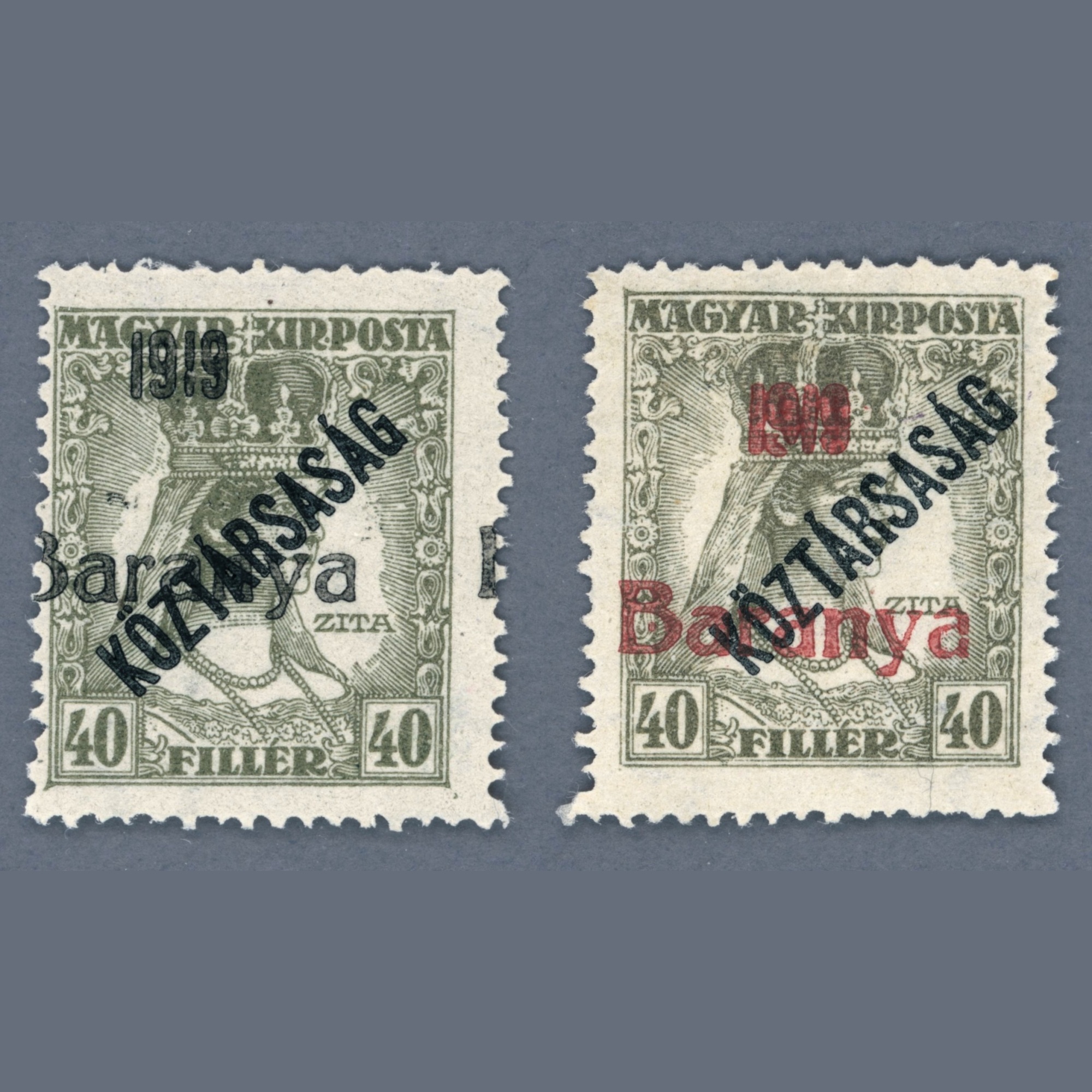 1919 Magyarország – Baranya I. Köztársaság / Zita 40 fillér fekete és cinóber felülnyomattal ** | Prüf: Bodor | PHu: 157 EUR