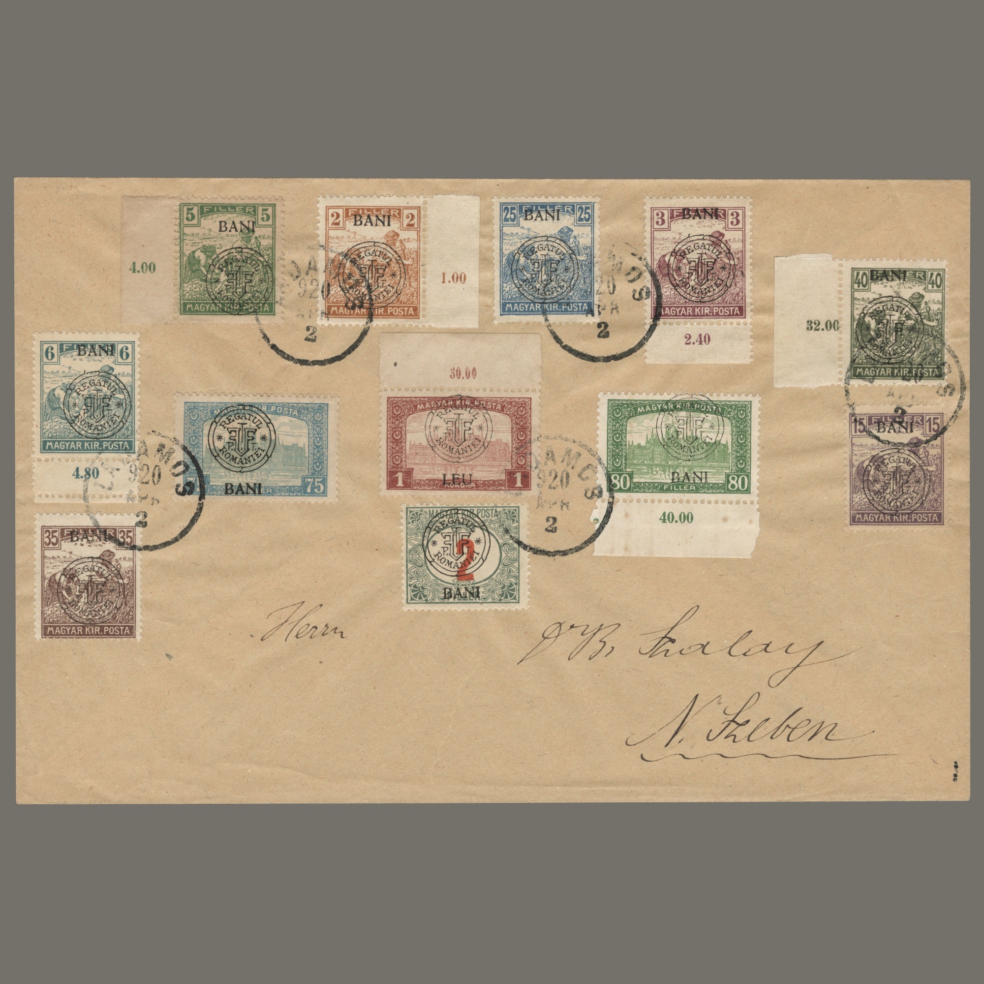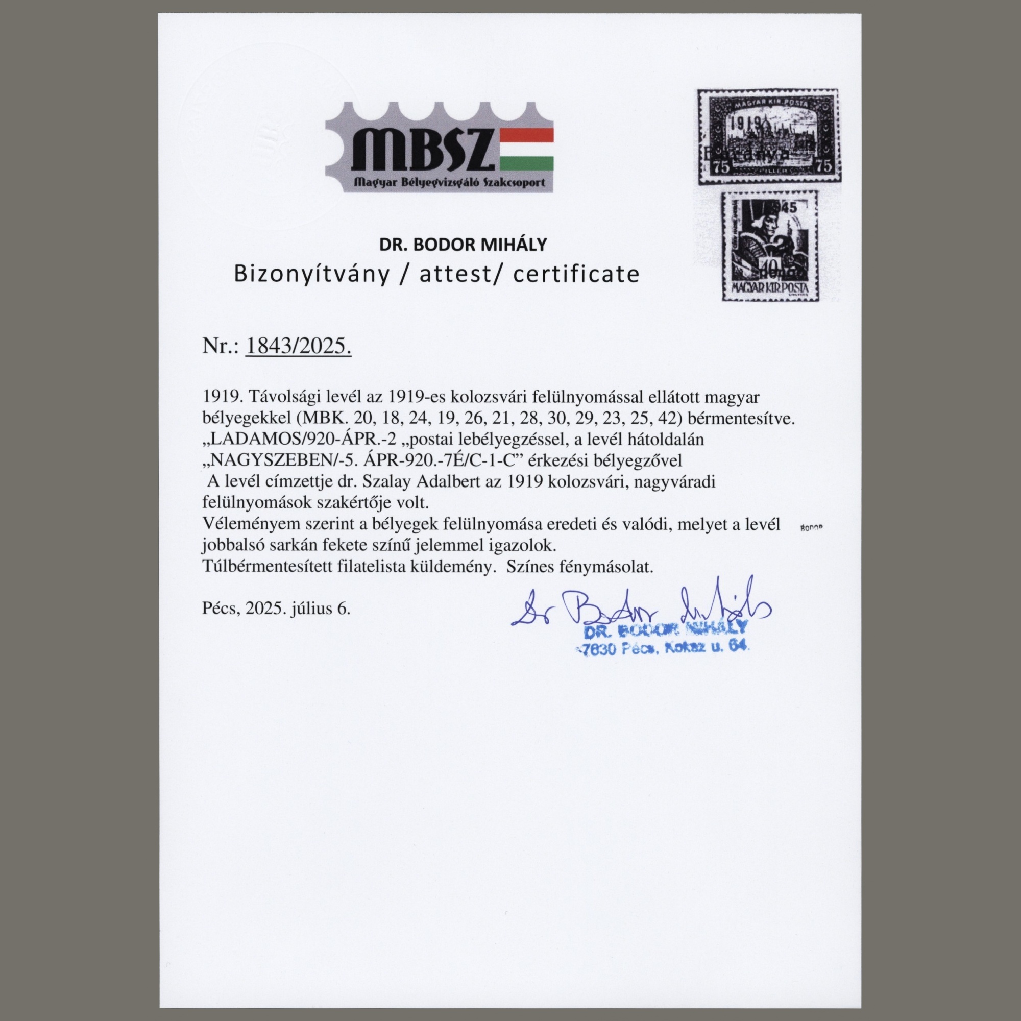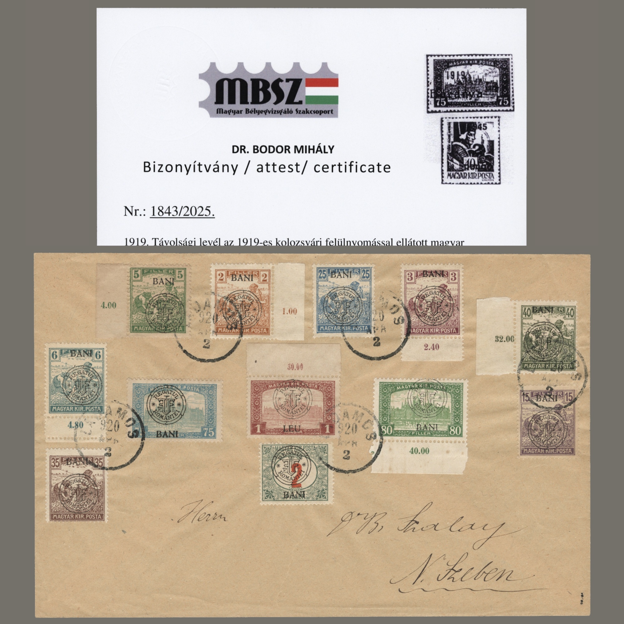 1919 Románia – Ladamosból Nagyszebenbe küdlött boríték kolozsvári felülnyomású bélyegekkel – Szalay Adalbert bélyegszakértőnek #2