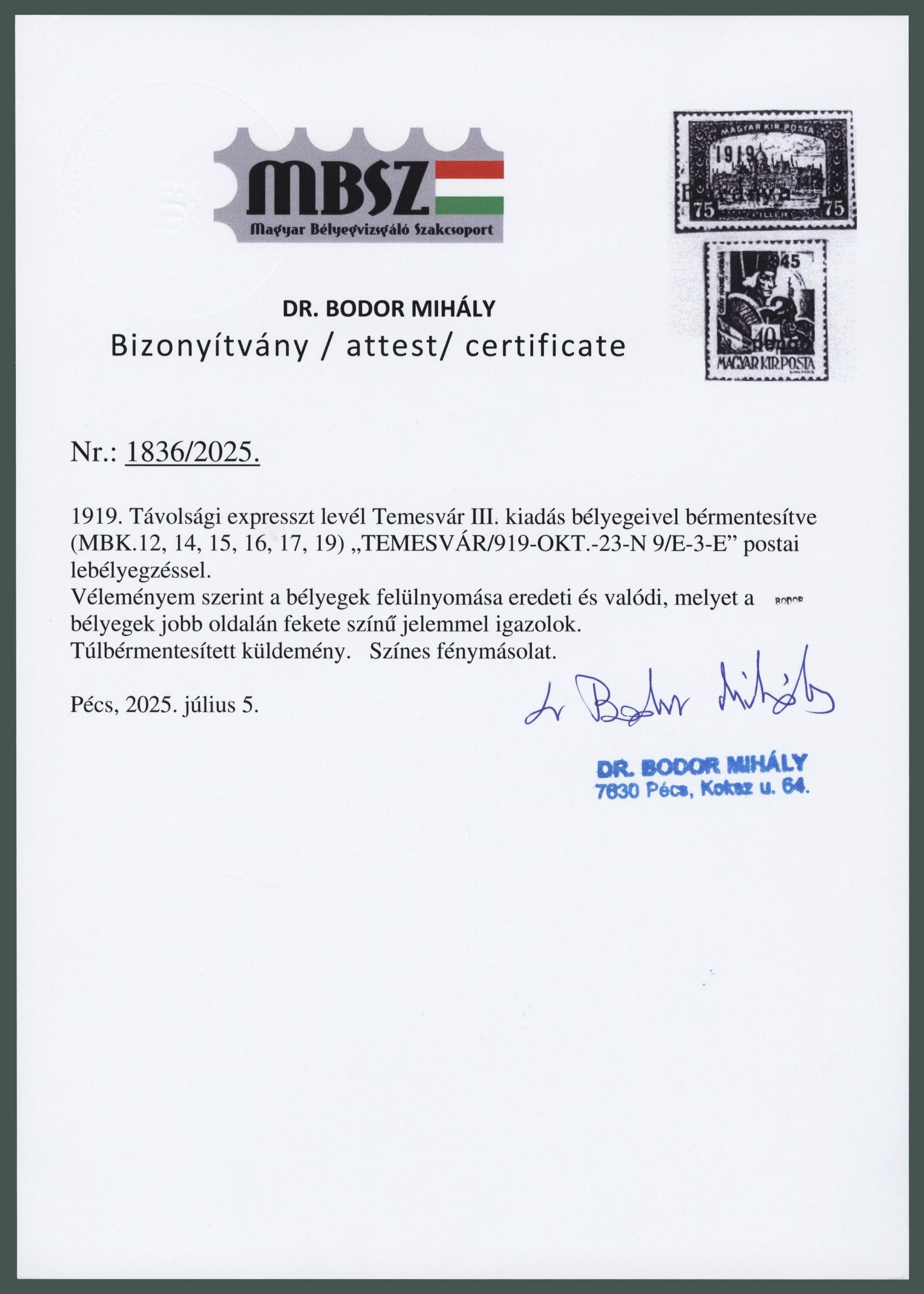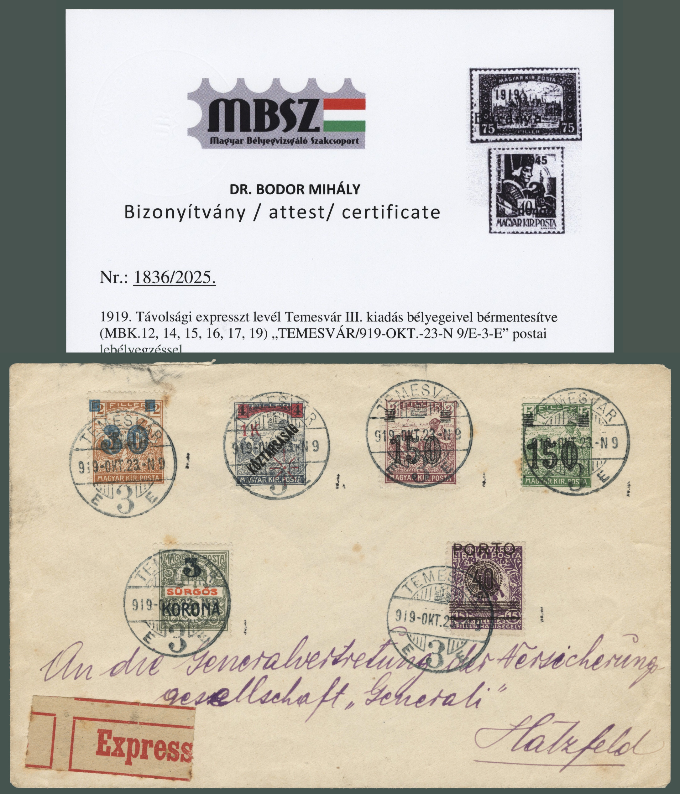 1919 Románia – Temesvár – expressz távolsági küldemény Temesvár III. felülnyomású bélyegekkel
