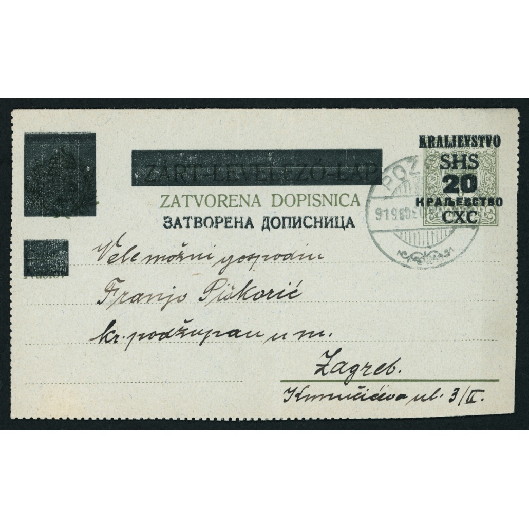 1919 SHS – felülnyomott 20 para / 6 f ritka zárt levelezőlap
