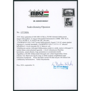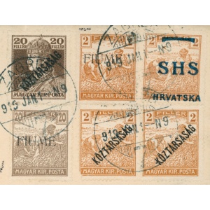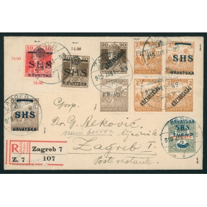 1919 SHS – zágrábi helyi vegyes bérmentesítésű ajánlott levél SHS, Fiume és köztársaság felülnyomású bélyegekkel | Attest: Bodor