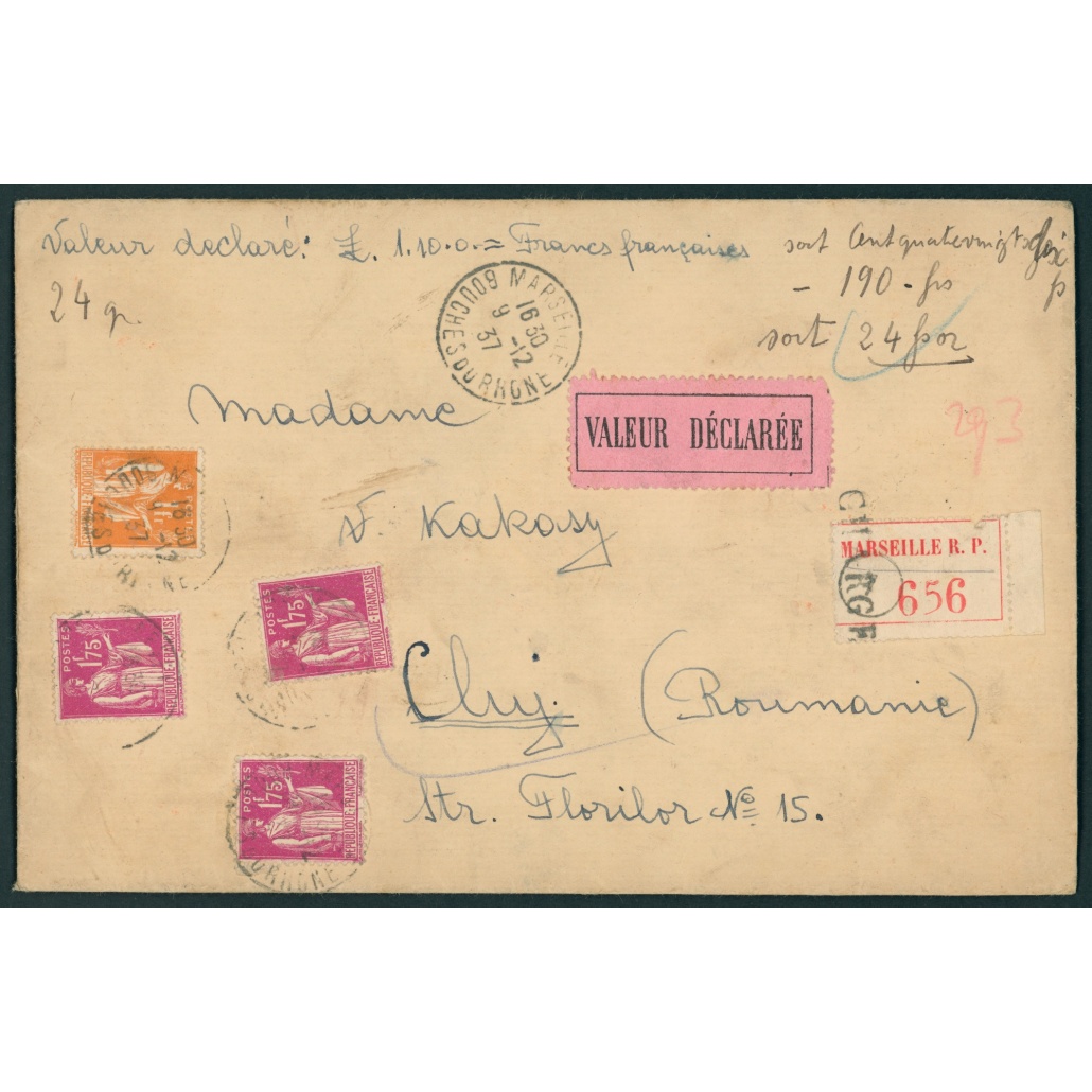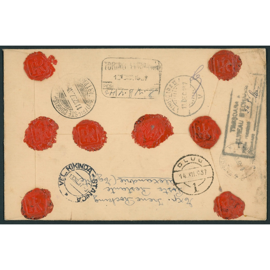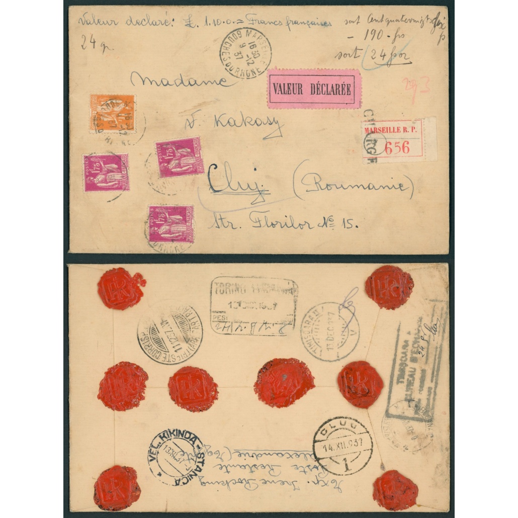 1937 Franciaország – Kolozsvárra küldött értéklevél olasz, jugoszláv tranzitbélyegzőkkel