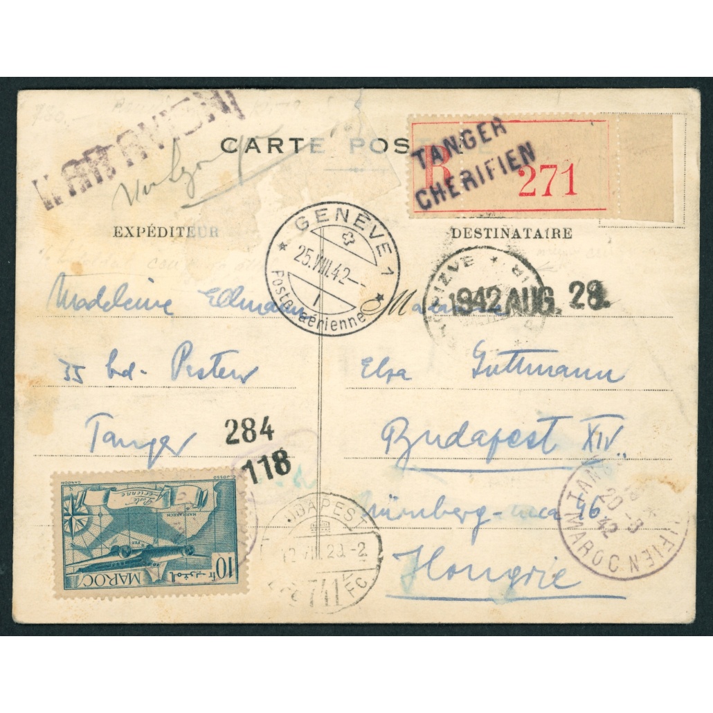 1942 Marokkó – Svájcon keresztül Budapestre küldött ajánlott légiposta levelezési lap – ritka küldemény fajta + PEKIR cenzúra és a cenzor alapos munkát végzett….