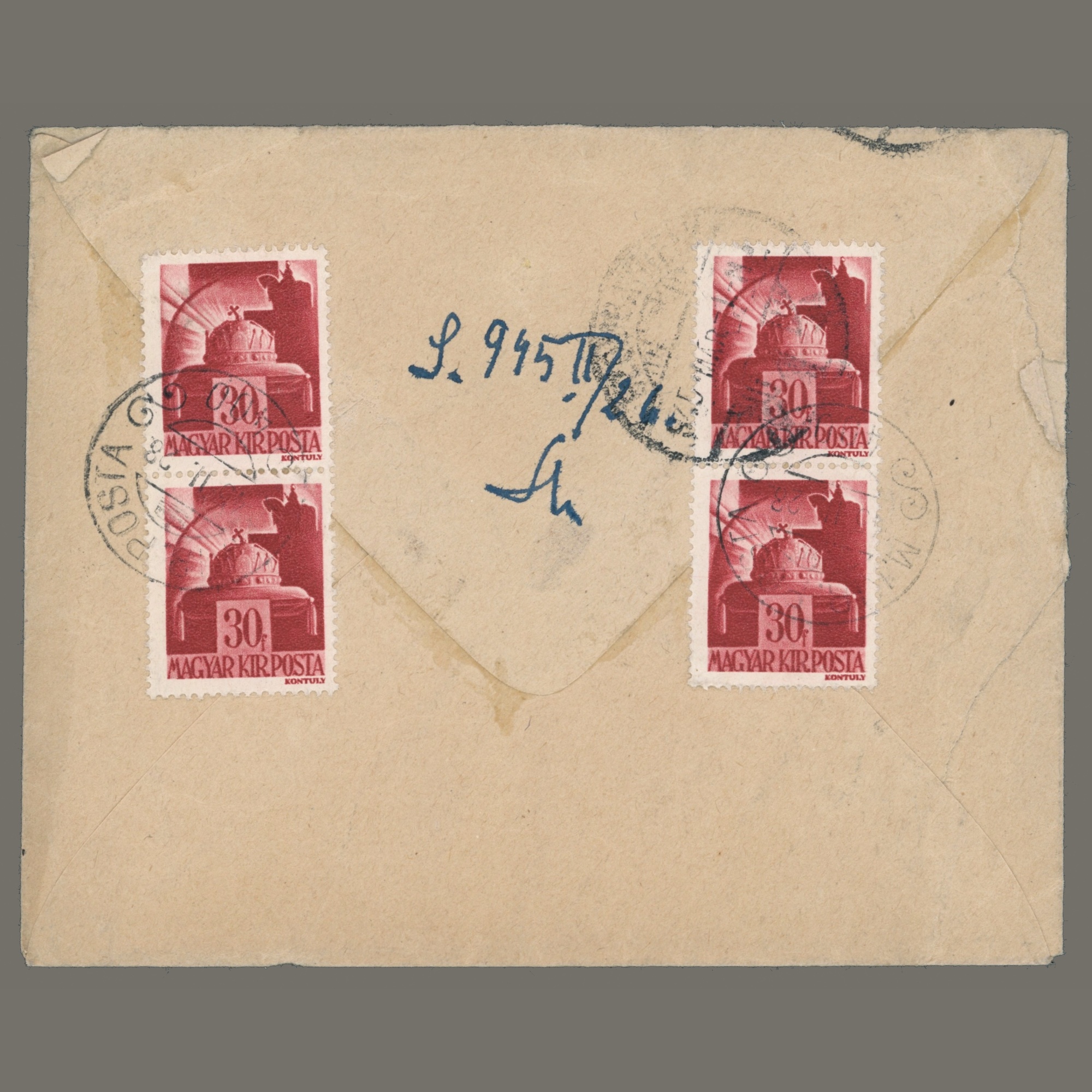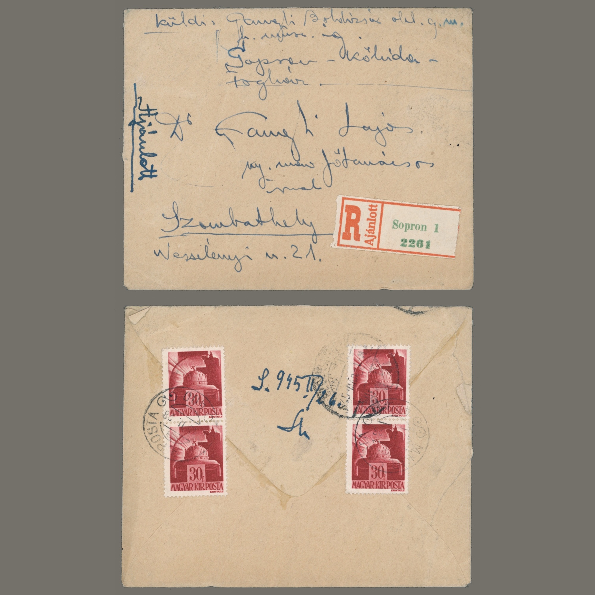 1945 Magyarország – február – Sopron-Szombathely ajánlott levél provizórikus „M.Kir Posta 400” acélbélyegzővel, sopron-kőhidai fogházból küldve