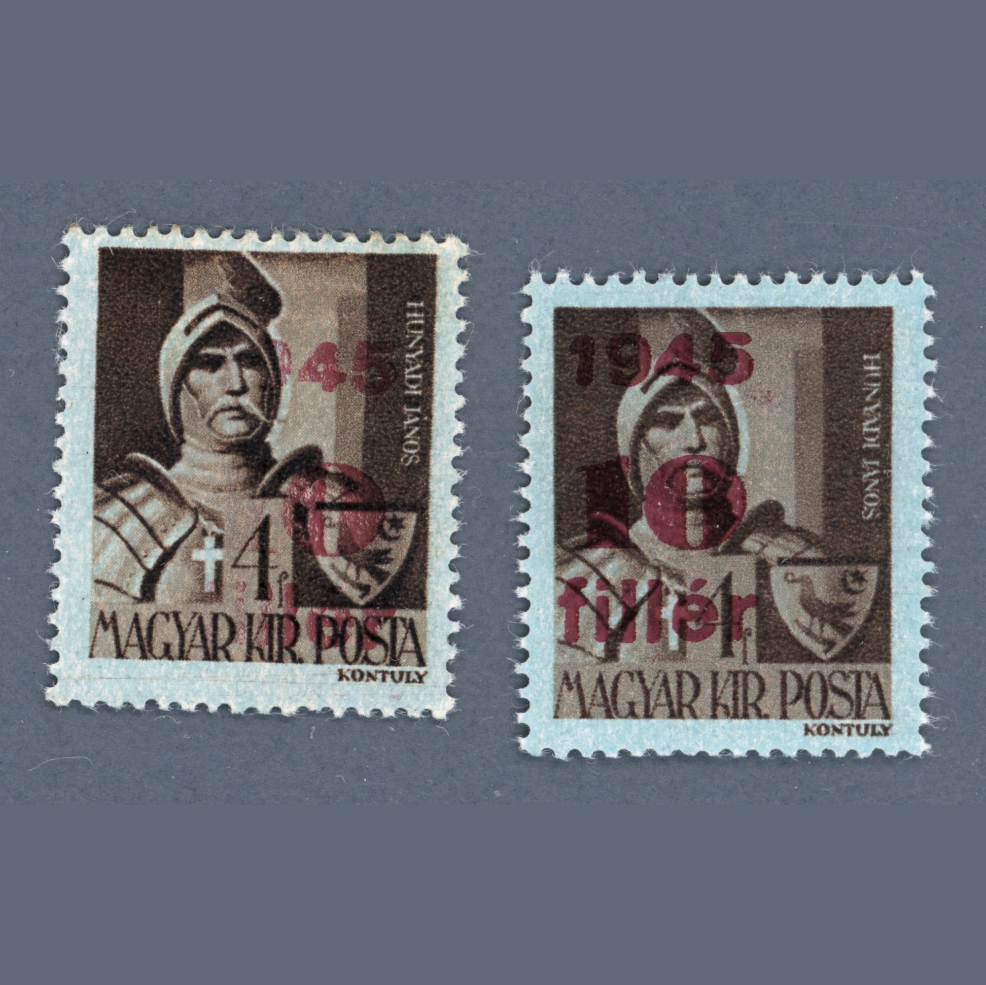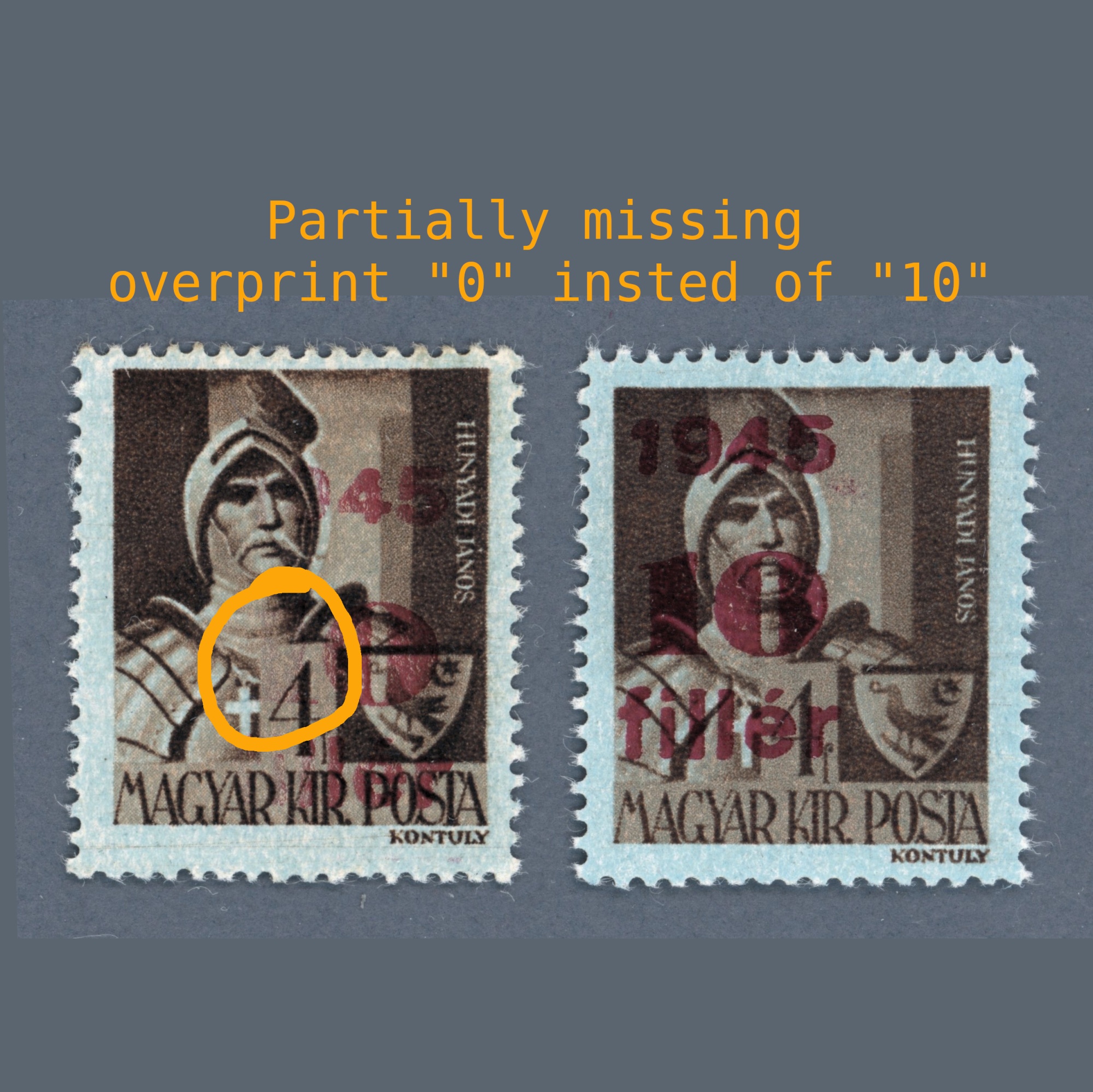 1945 Magyarország – Kisegítő 10/4 fillér postatiszta * színhiányos felülnyomással a “10” helyett csak “0” látszik + támpéldány