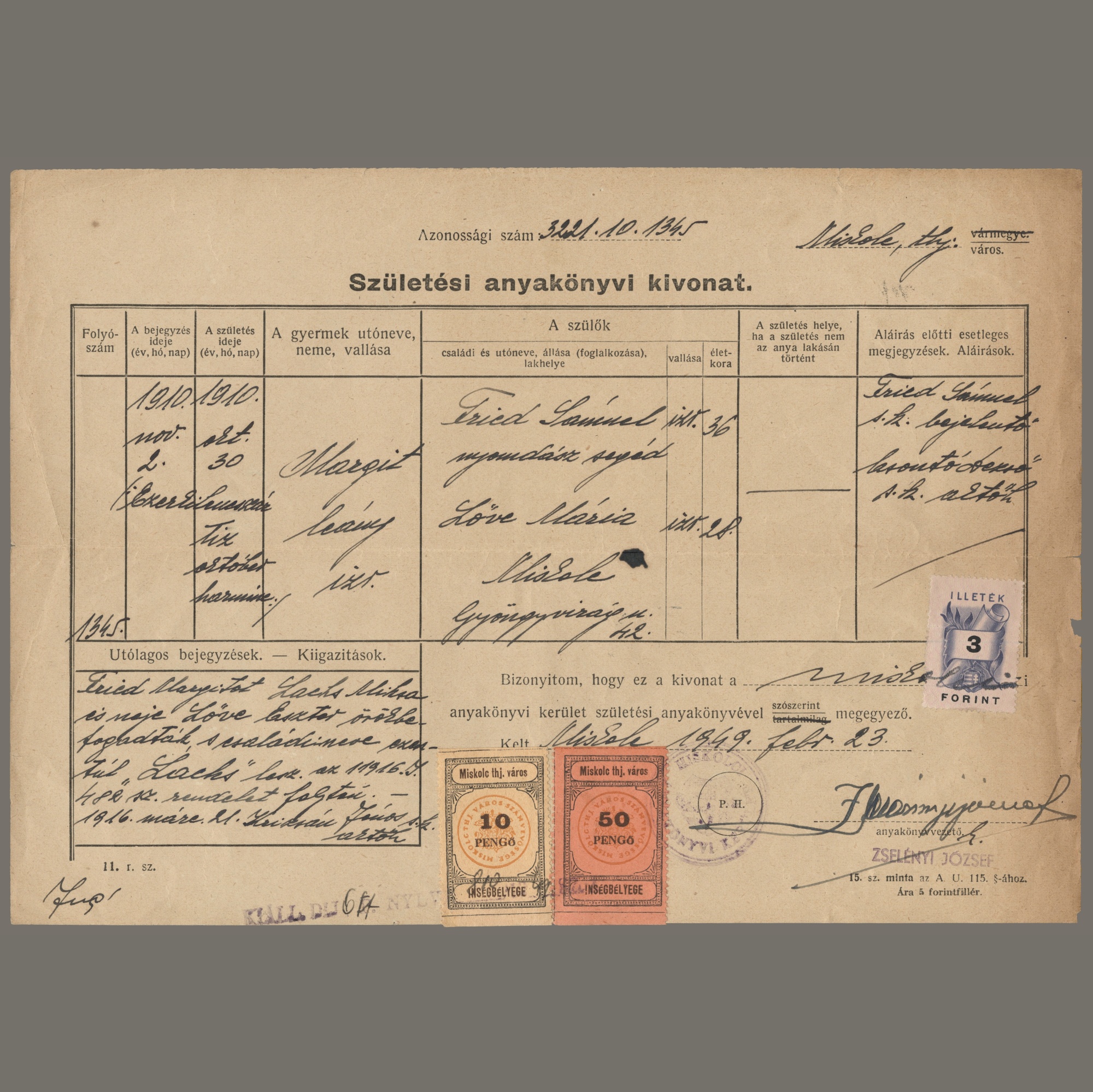 1949 Magyarország – anyakönyvi kivonat miskolci ínségbélyegekkel – a 6 Ft díj megfizetése 60 pengő (!) ínségbélyeggel jelölve – A 60 pengős bélyegen tévnyomatos felirattal: “!NSÉGBÉLYEG”