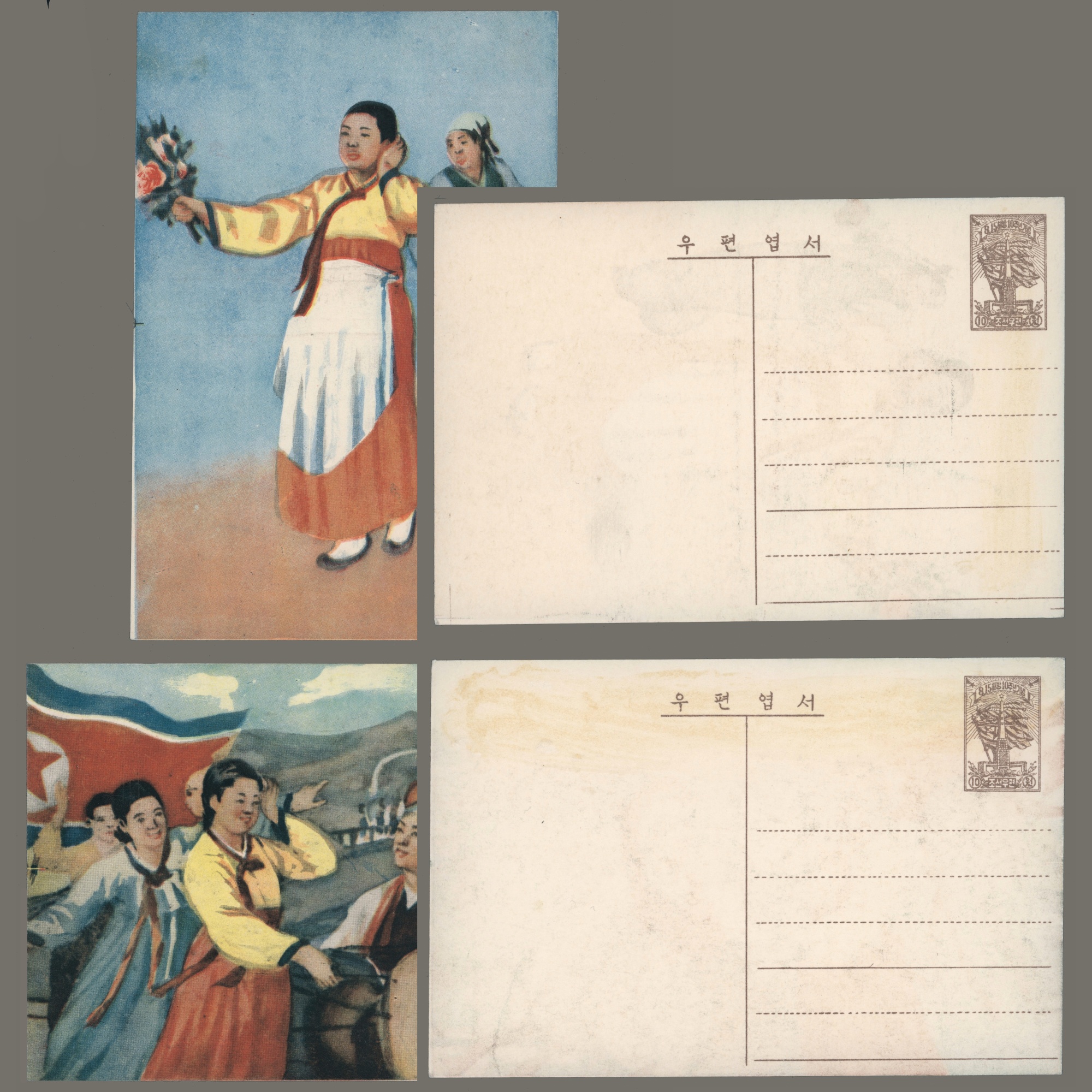 1955 Észak-Korea – Két használatlan díjjegyes képeslap a „The 10th Anniversary of Liberation from Japan” benyomott bélyeggel