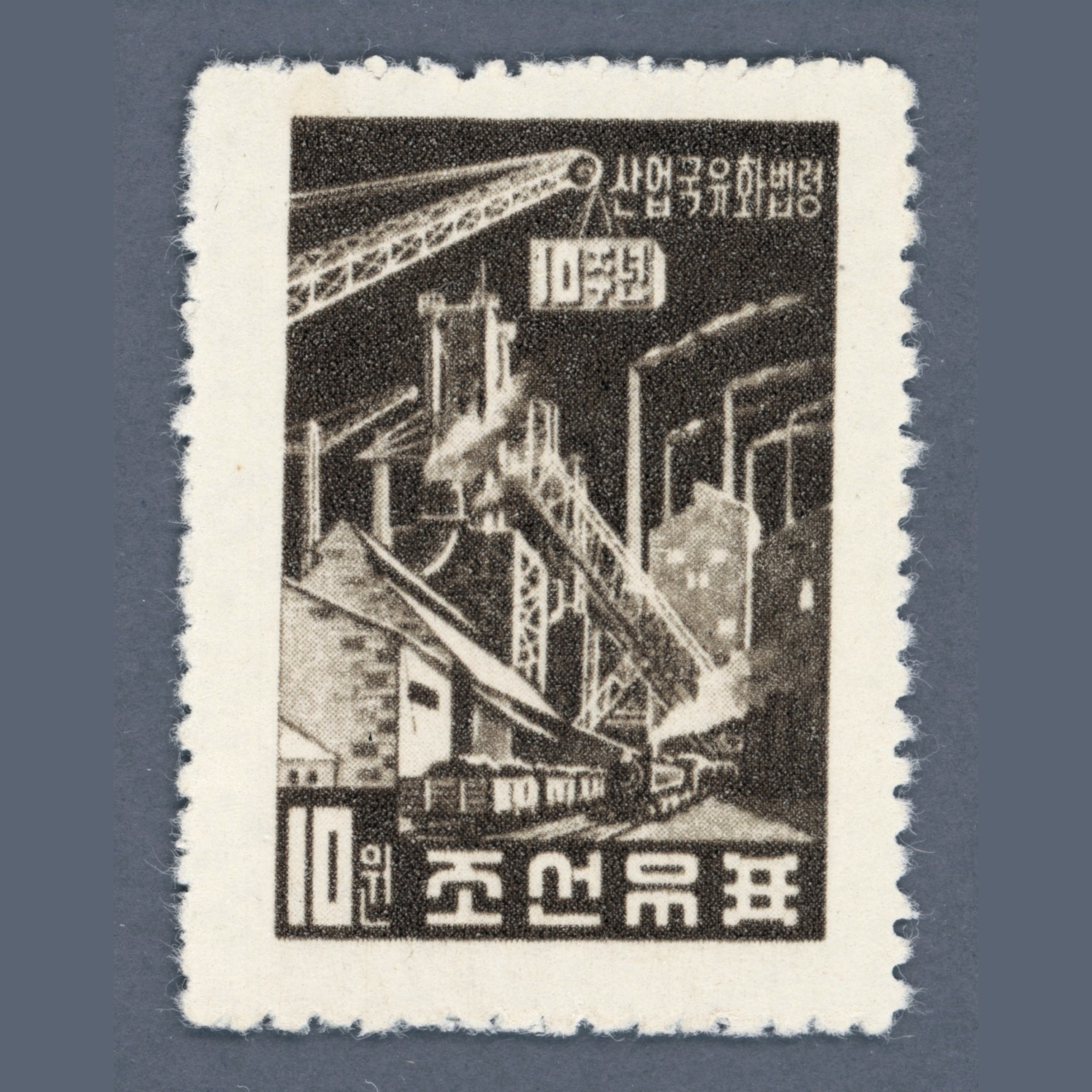 1956 Észak-Korea – „10th Anniversary of Proclamation of the Law on Nationalization of Major Industries” 10 won postatiszta | KSD: 108 USD