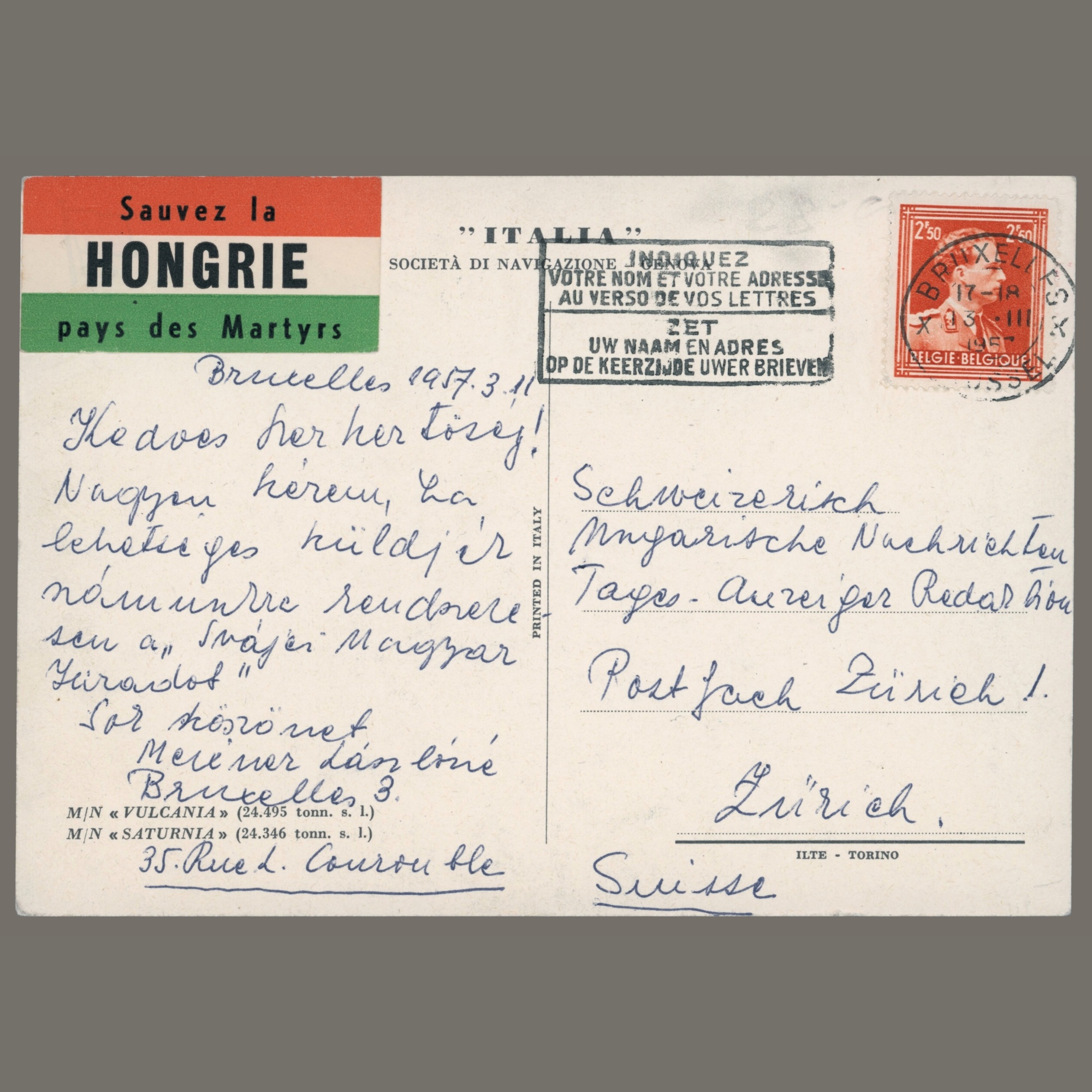 1956 Magyarország – Magyar menekültek levele Belgiumból Svájcba, a Svájci Magyar Hírmondó újság megrendeléséről – “Mentse meg Magyarországot, a mártírok országát” feliratú levélzáróval
