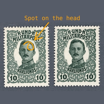 • 1918 Austria – K.u.K. Militarpost – Charles IV. mint hinged * 10 heller stamp with spot on the forehead misprint + reference item