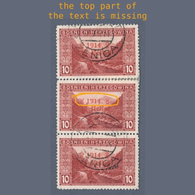 • 1914 Austria – Bosnia and Herzegovina – triple stripe with overprint type I. – overprint partially missing on the middle stamp