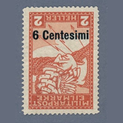 • 1918 Austria – Militärpost 6 Centessimi / 2 Heller with inverted overprint (proof) in mint hinged condition, reverse is signed and has gum disturbance | Ferchenbauer MNH price is: 250 EUR