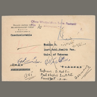 • 1968 Slovakia – cover sent from Kassa to Tehran, forwarded to Frankfurt, stamps lost in transit as indicated by the purple ‘Ohne Wertzeichen beim Postamt eingegangen Ffm 70’ postmark