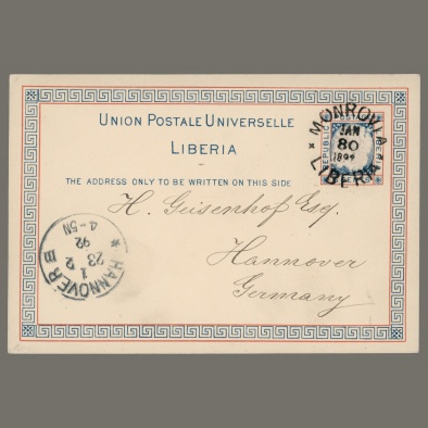 • 1892 Liberia – Postal stationery with a scraped portrait of the president sent to Germany