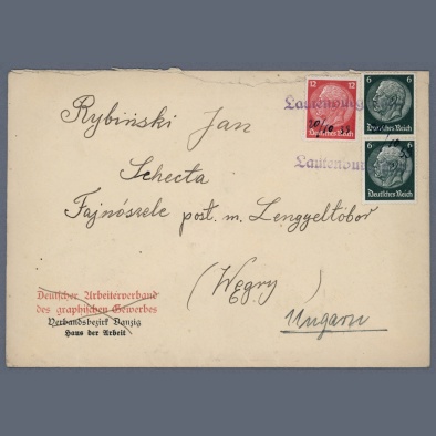 • 1939 Germany – Cover sent from Lautenburg Polish internment camp to the Polish internment camp in Tápiószele, Hungary, with Lautenburg provisional postmark and hand-dated addition.