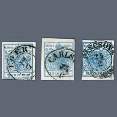 1850 Austria – three 9 kr HP type I stamps, P232, P143, P58 sheet positions