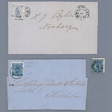 • 1855 Sweden – 4 Sk. with nice postmark and the 1858 12 ÖRE in both colours on the covers
