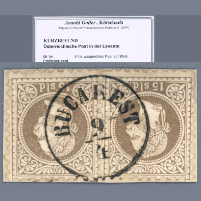 • 1867 Hungary – Romania Levante 15 sld pair with BUCAREST postmark | Ferchenbauer: 250 EUR