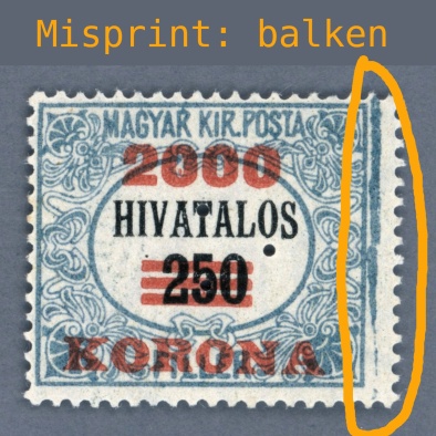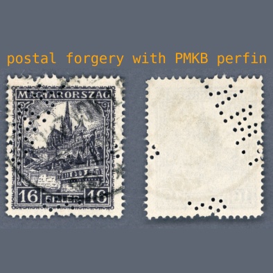 1926 Hungary – postal forgery 16 filler with P.M.K.B. perfin, a perfin rarity