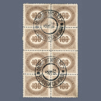 • 1899/1900 Austria – Postage due used 100 heller in a block of eight – used big blocks are rarely seen (total 8 korona)