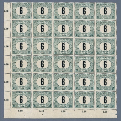 • 1905 Hungary – Porto / postage due 6 filler (perforation B – 15) mint block of 30 with B1 watermark. The fourth line is perforated smaller and the fifth is larger. | Mi: 12 | Phu: 12. / 465++ EUR