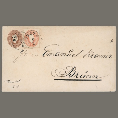 • 1861 Austria – Hungary – 10 kr postal stationery envelope with 5 kr additional postage, sent from Pest to Brno as zone III cover