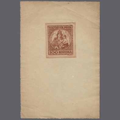 • 1923 Hungary – 100 Korona value of the Madonna set as an engraved stamp desing my Hellbing F. (designer of the stamp), on ribbed paper