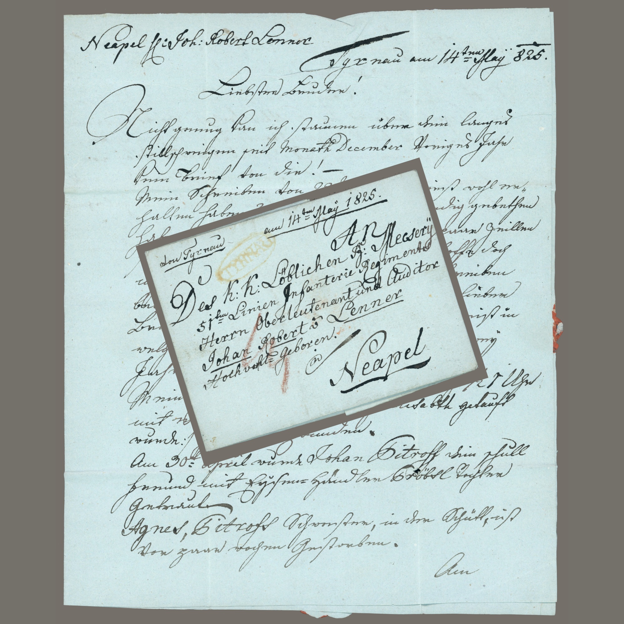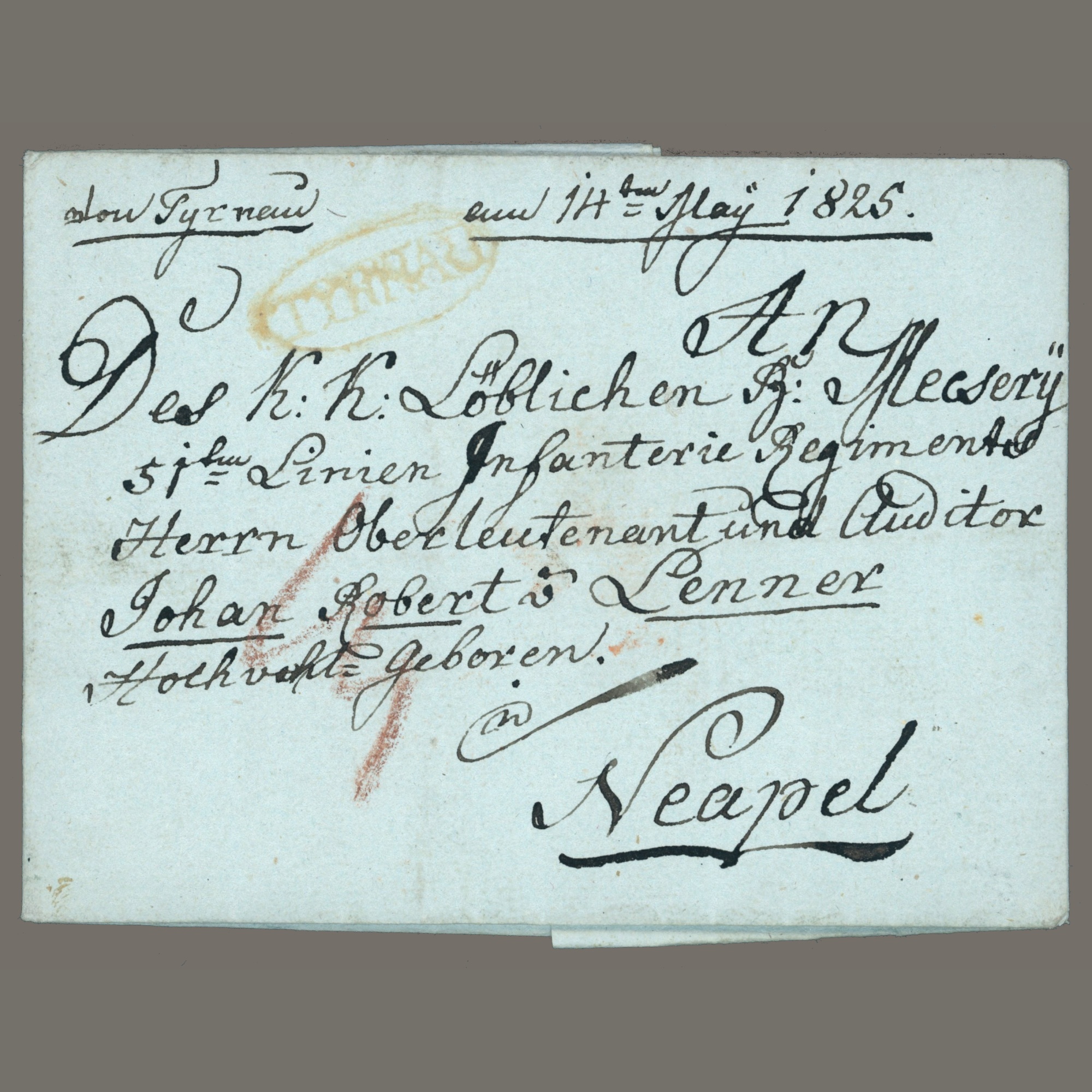 1825 Austria – yellow TYRNAU postmark on a postage due letter sent abroad to Naples (Kingdom of the Two Sicilies – Regno delle Due Sicilie)