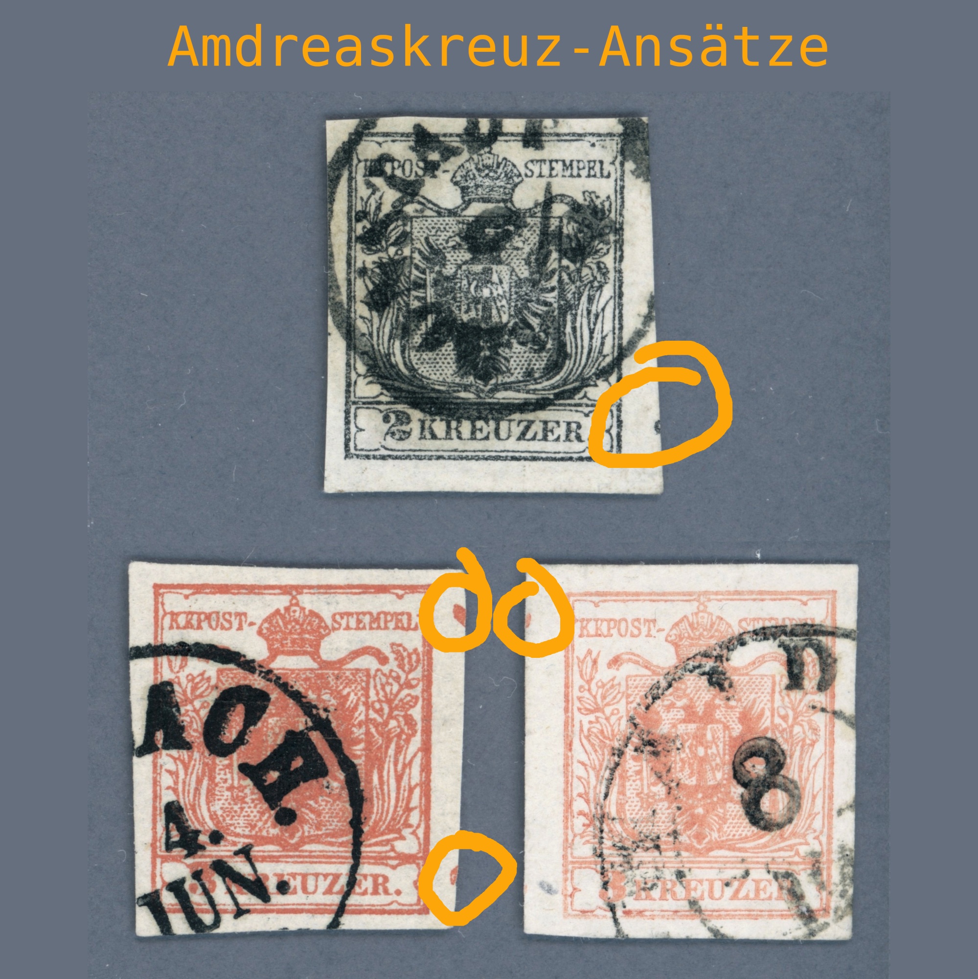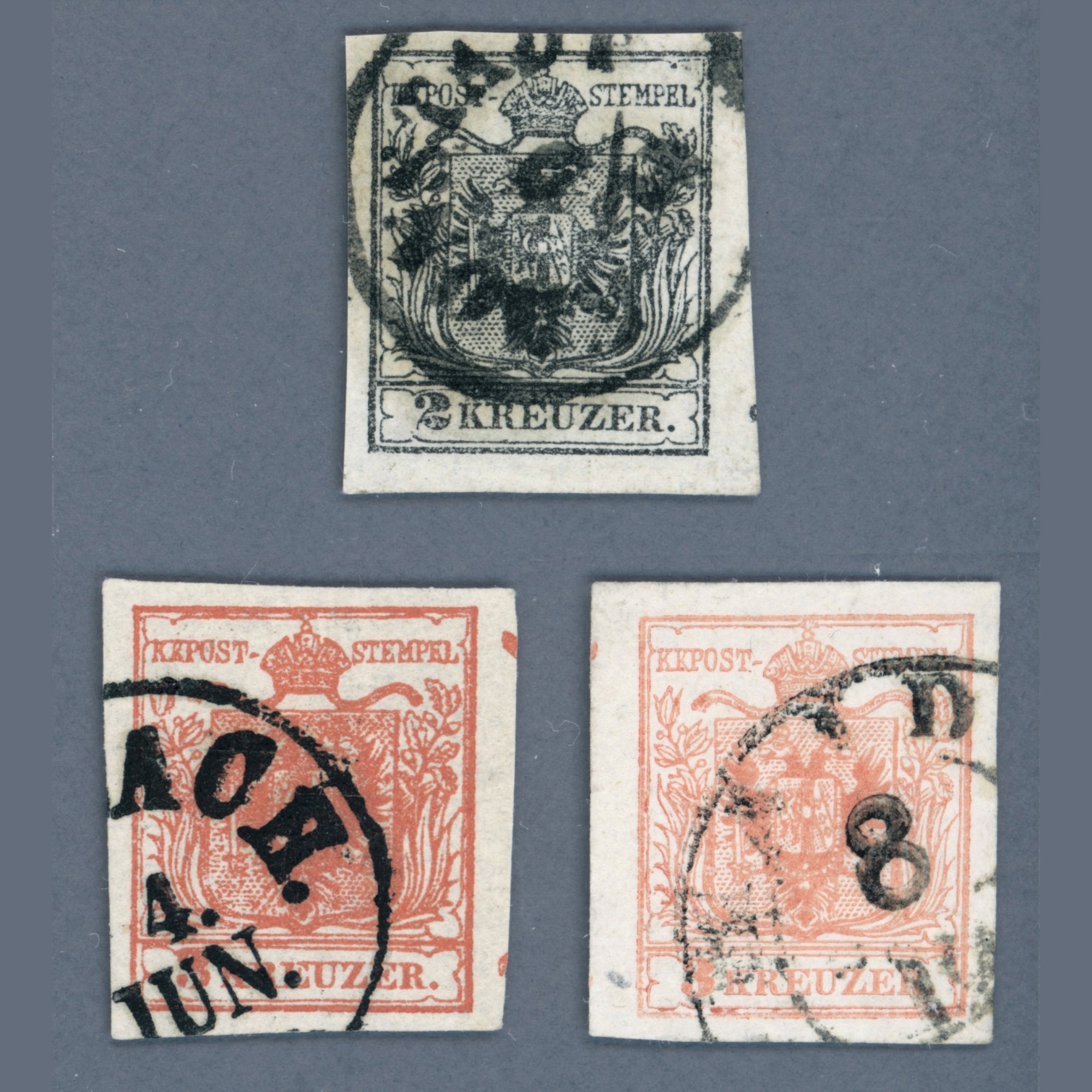 1850 Austria – 2 kr HP type IIIa KRONSTADT postmark and two 3 kreuzer stamps. Each stamp with Andrew’s cross ending on the side | Ferchenbauer: 250 EUR