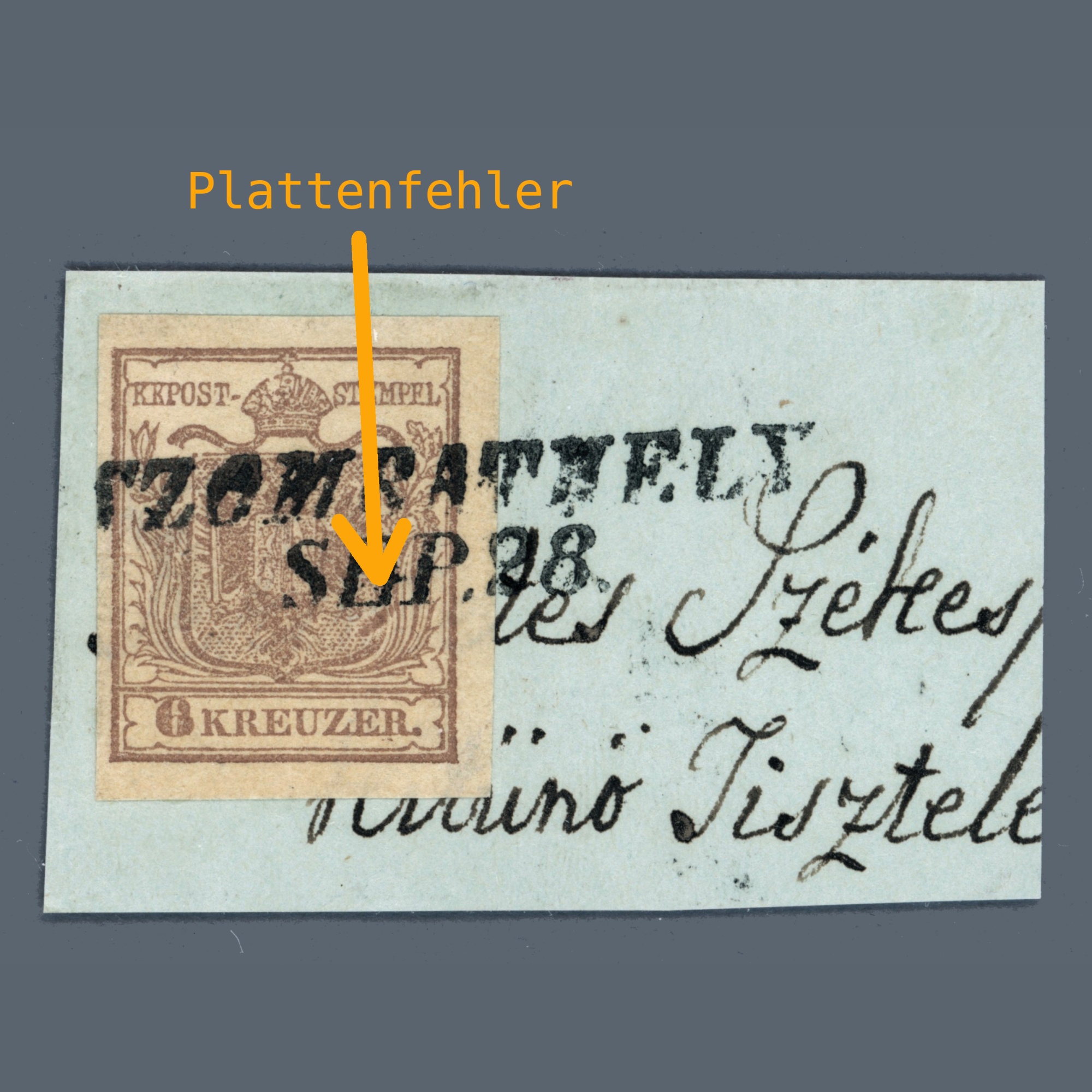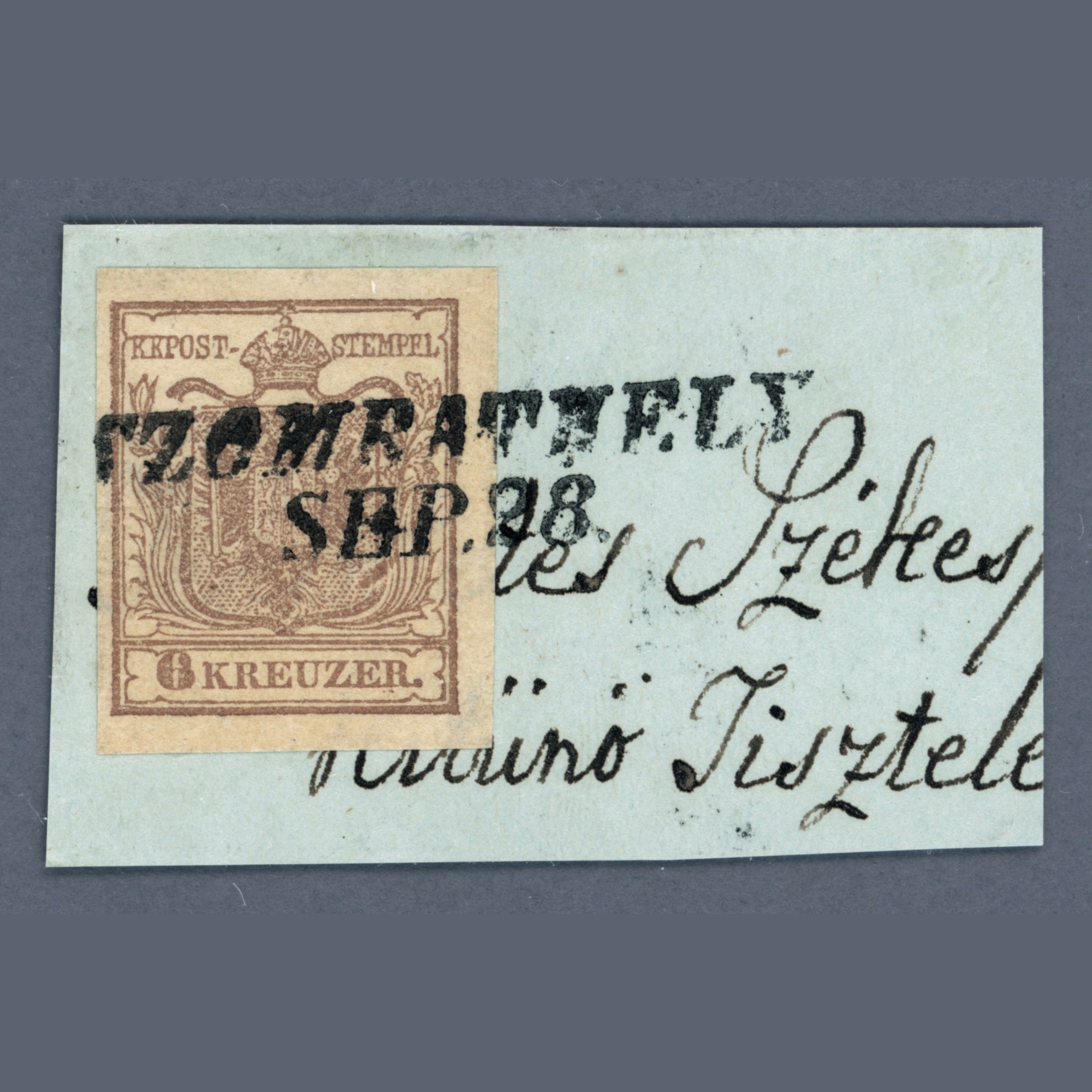 1850 Austria – 6 kr HP type I with printing error – paper error with SZOMBATHELY postmark
