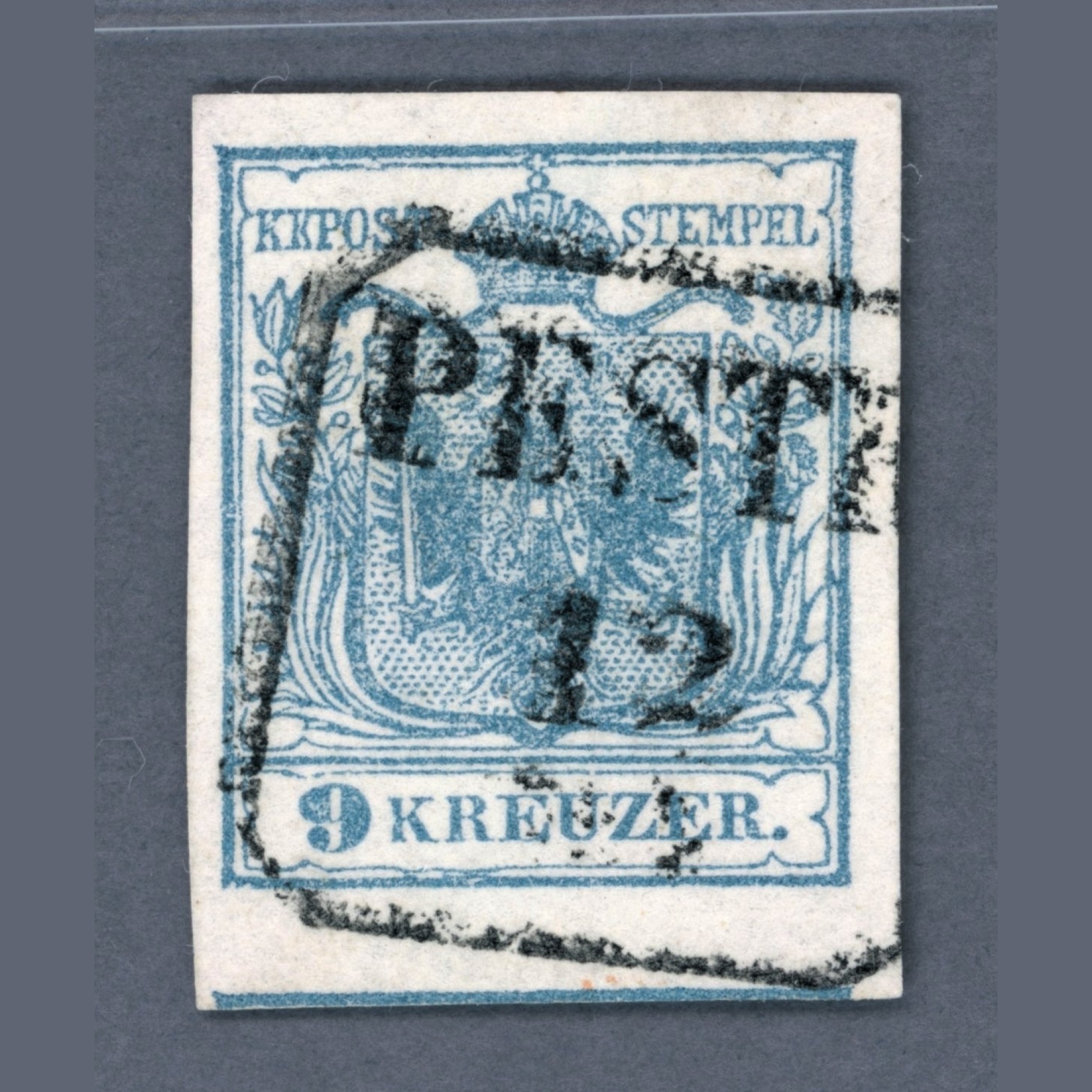 1850 Austria – 9 kr Type I with nice edges, with corrected (retouch) horizontal line under “9 KREU” – PESTH postmark