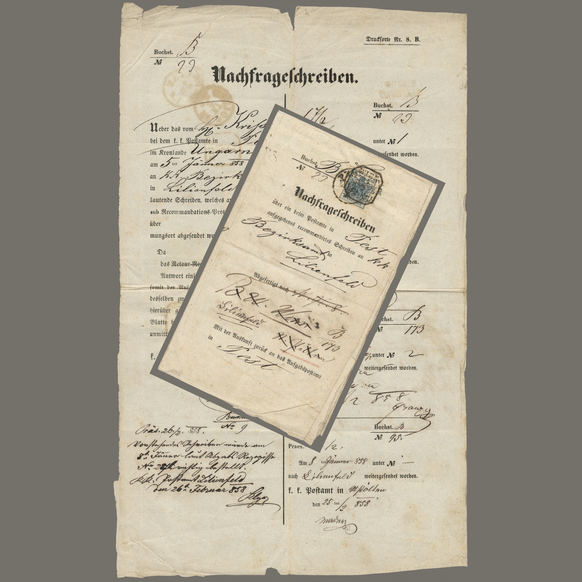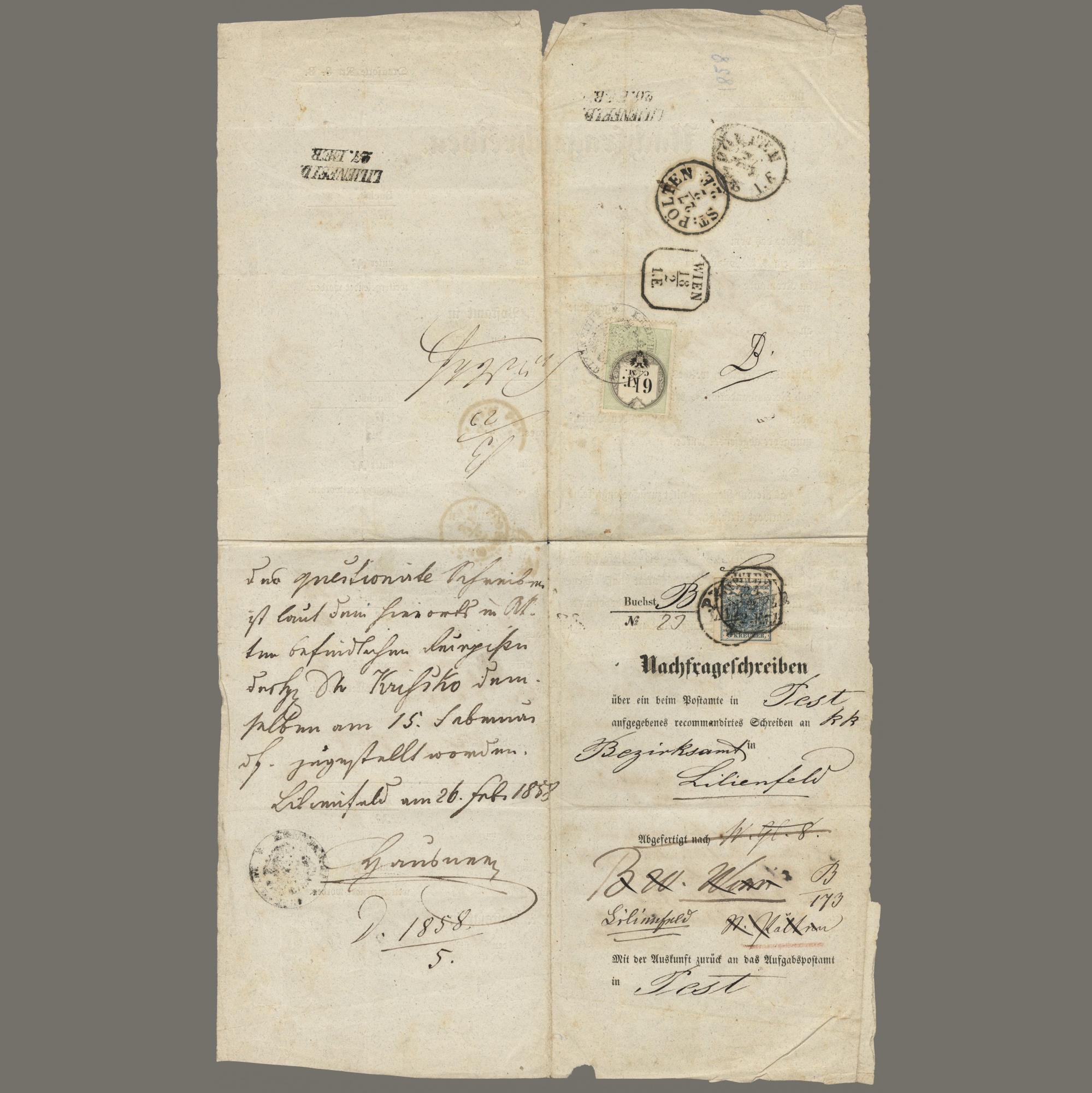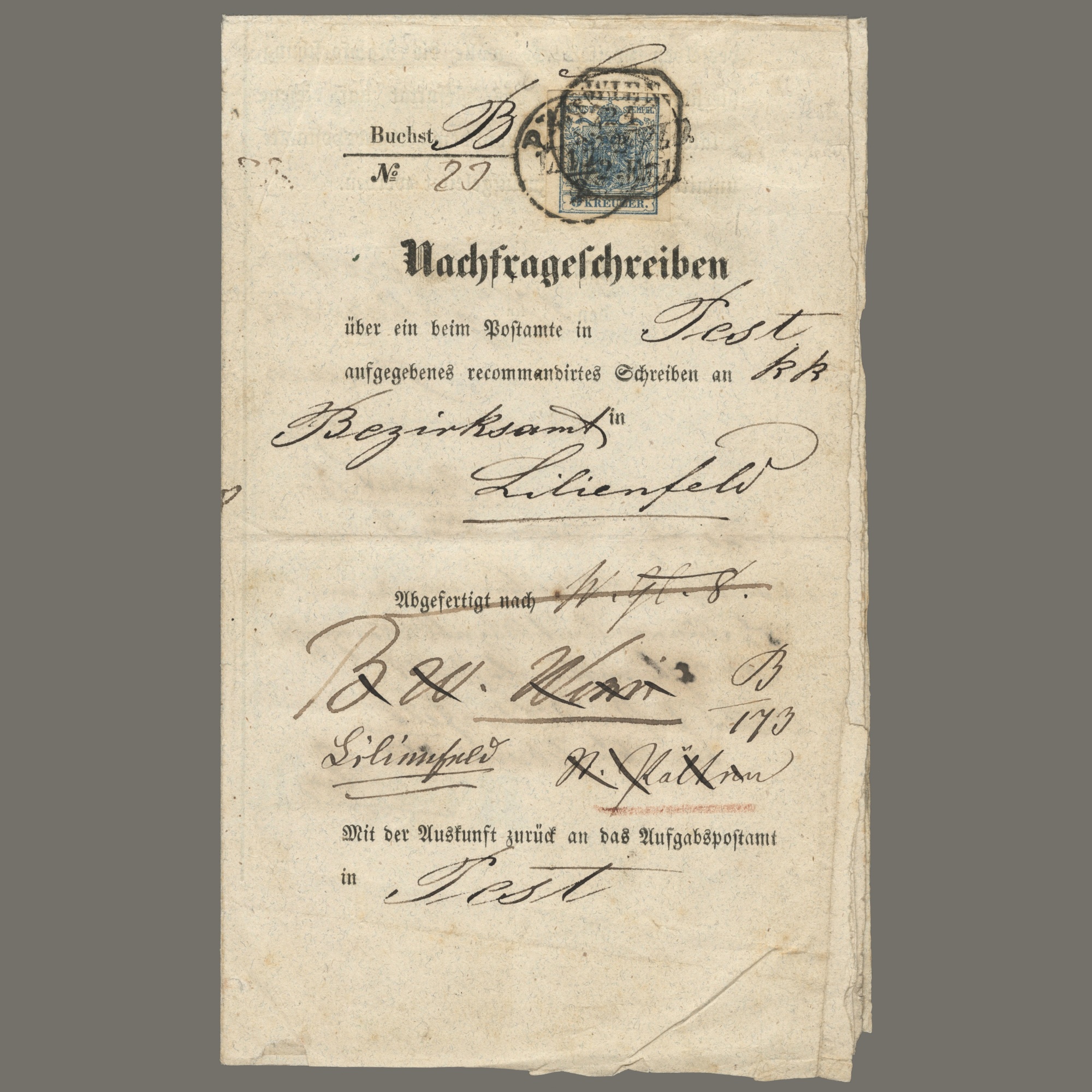 1850 Austria – Hungary – Postal claim form from Pest to Nilienfeld with 9 kr stamp
