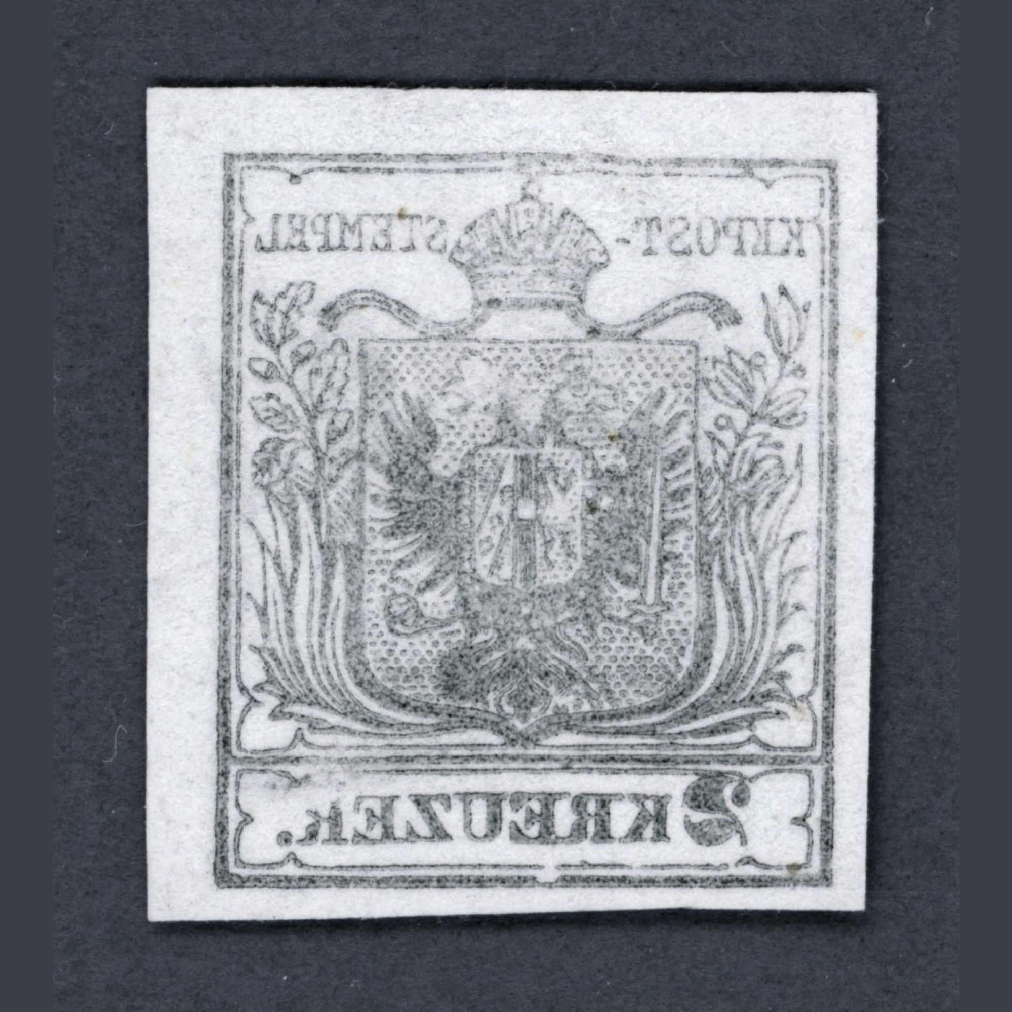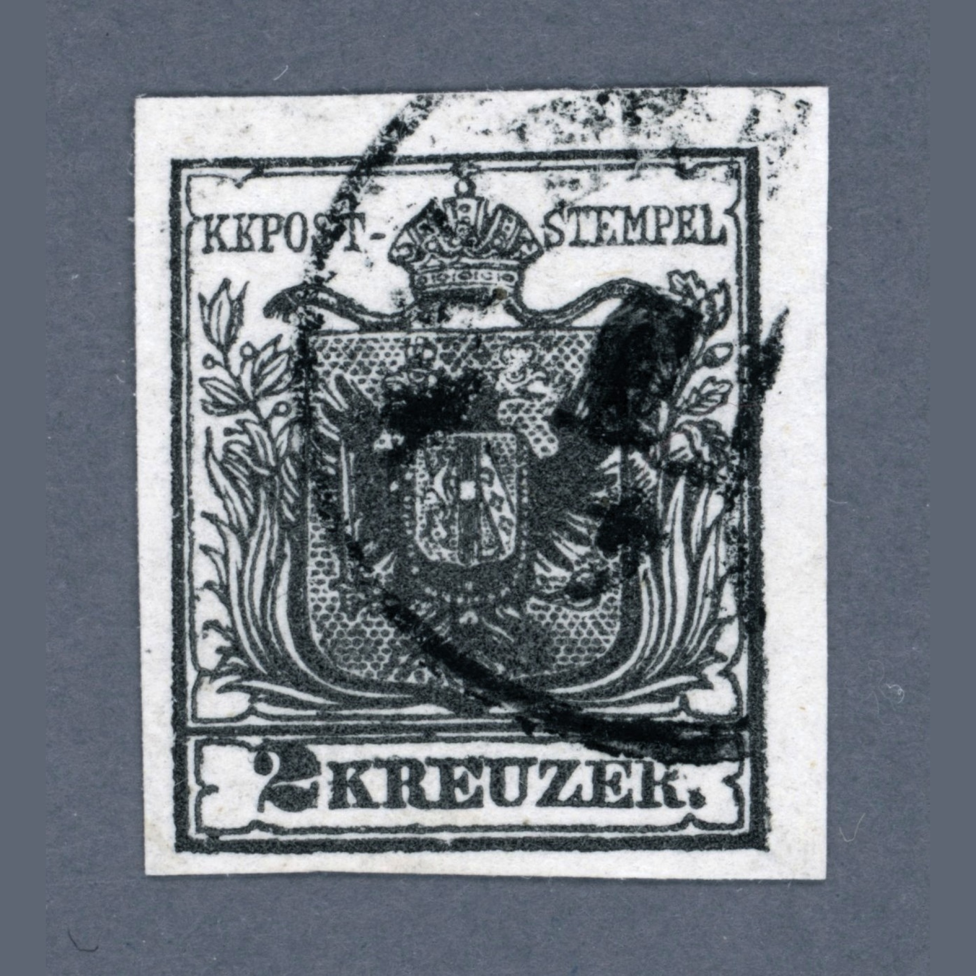 1850 Austria – used 2 kr HP Ib type with machine colour offset and minor plate error: “Beschädigung des Wortes KREUZER” | Ferchenbauer: 270 EUR