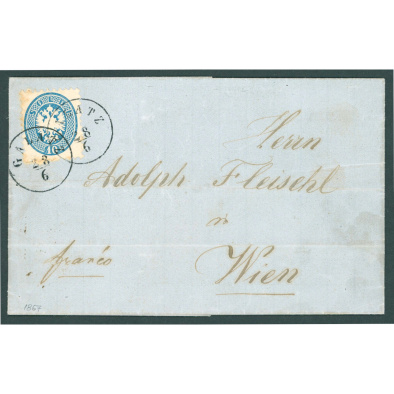 1853 Austria – In Kisborosnyo, due to the lack of a 15 kroner signet paper, one 10 and two 3 kroner signet papers were sewn together for the proper collection of duties