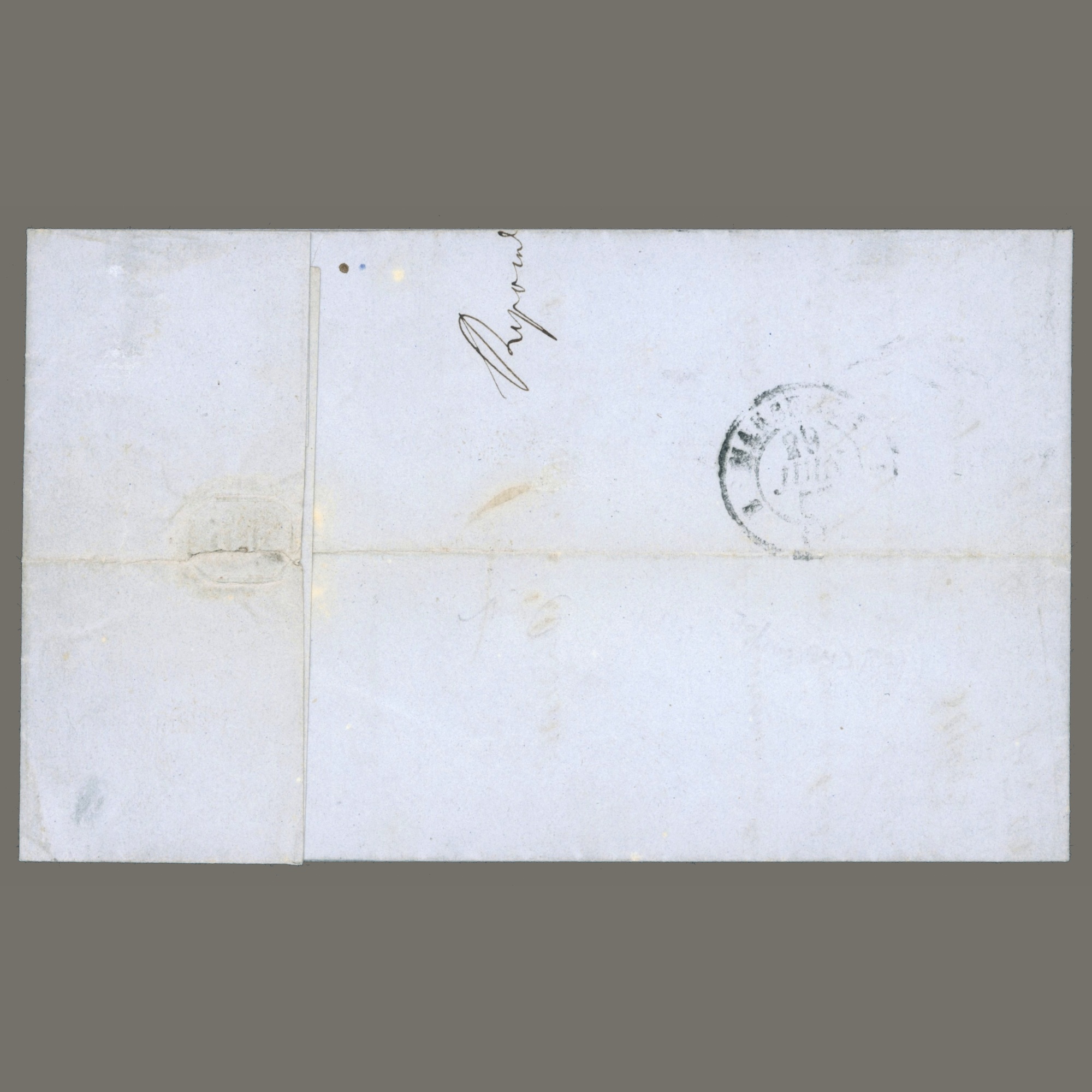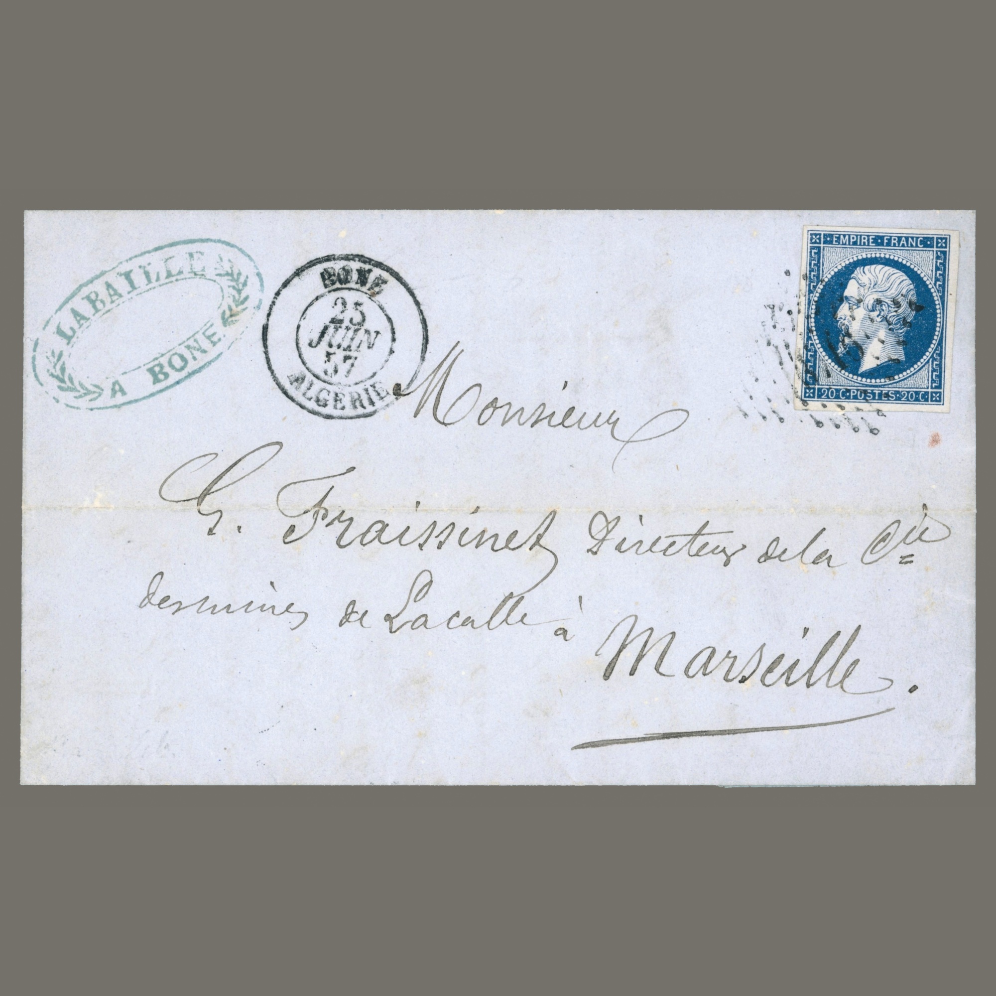 1857 France – Letter sent from Algeria to Marseille with Napoleon imperforated 20c (nice margins)