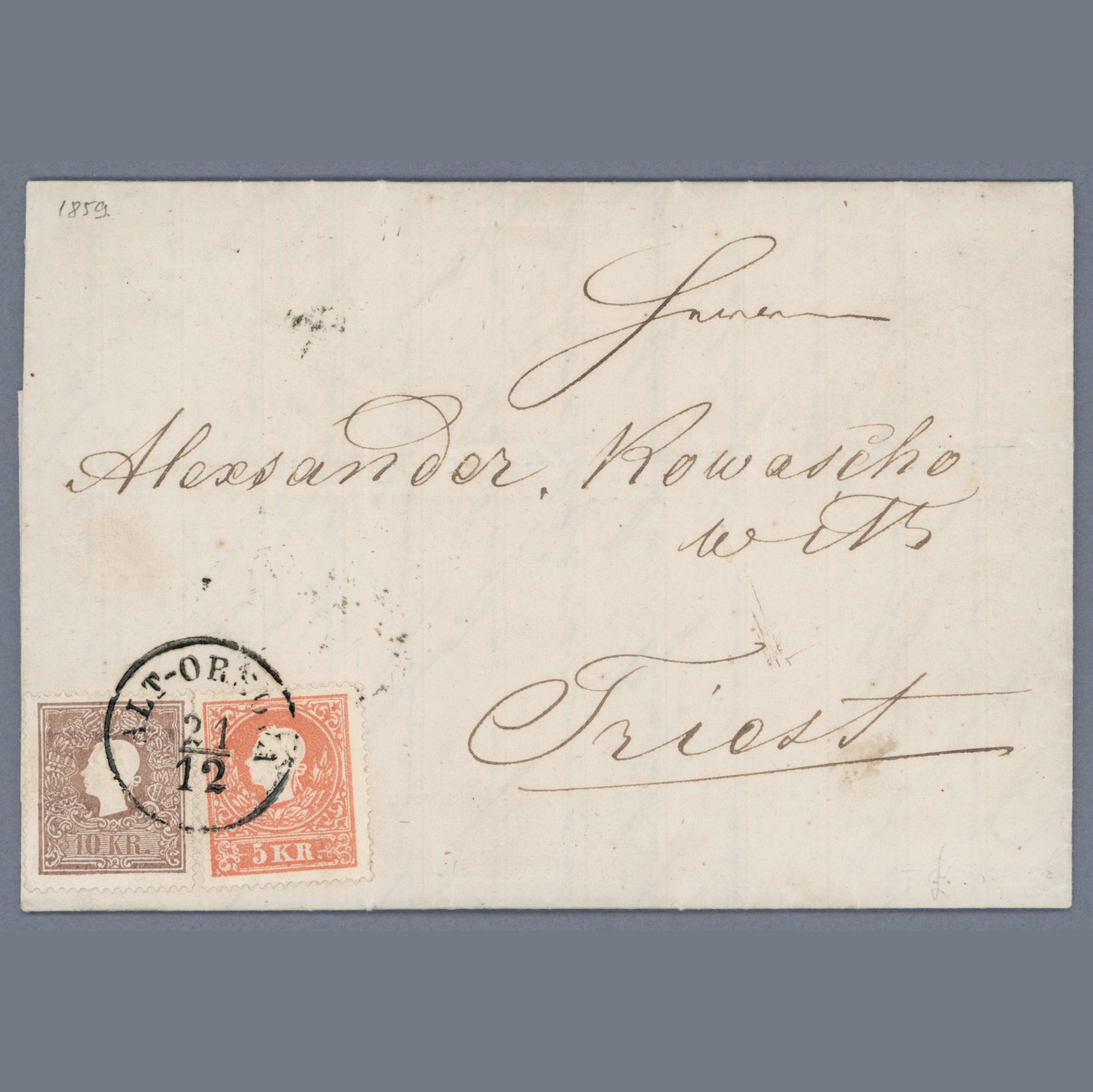 1858 Austria – Hungary – Romania – two-colour franked, nice quality letter without a fold mark on the front side, and with Alt-Orsova postmark
