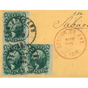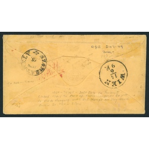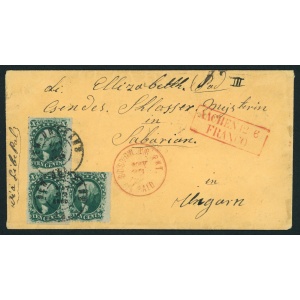 1860 USA – Cover sent to Hungary with 30 cent Prussian “closed mail” rate with red BOSTON BR PKT / 7 PAID and red AACHEN cancellation. Very early rare destination from the pre-UPU era.