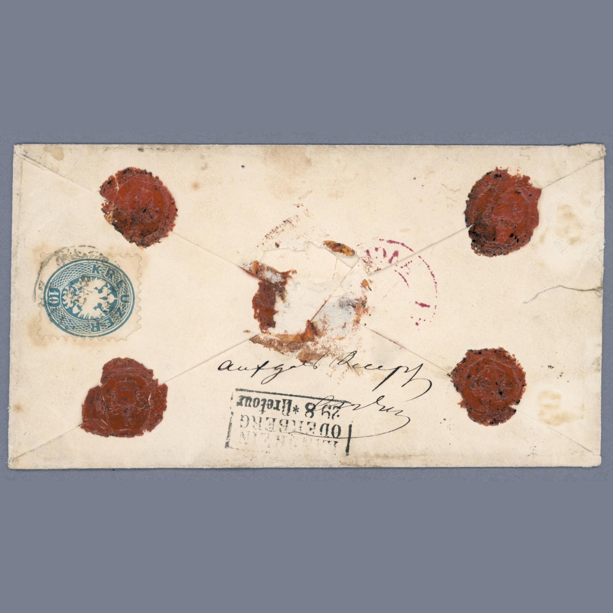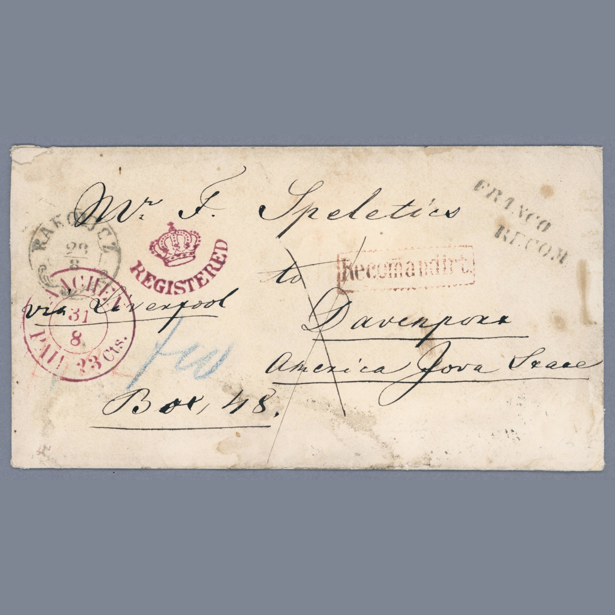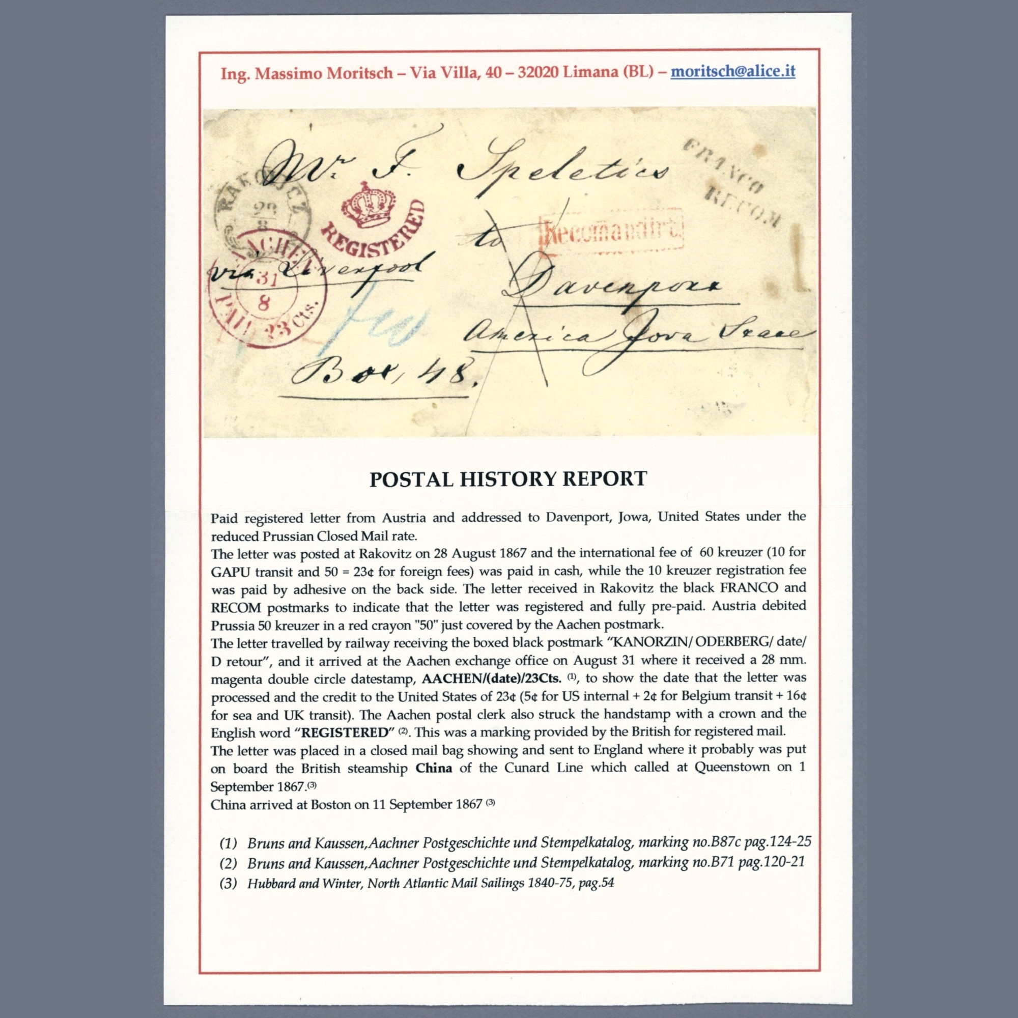 1867 Austria – registered letter sent from the Hungarian territory (from the territory of present-day Slovakia) to the US (Davenport) – with RAKOVICZ postmark – Expert opinion: Moritsch