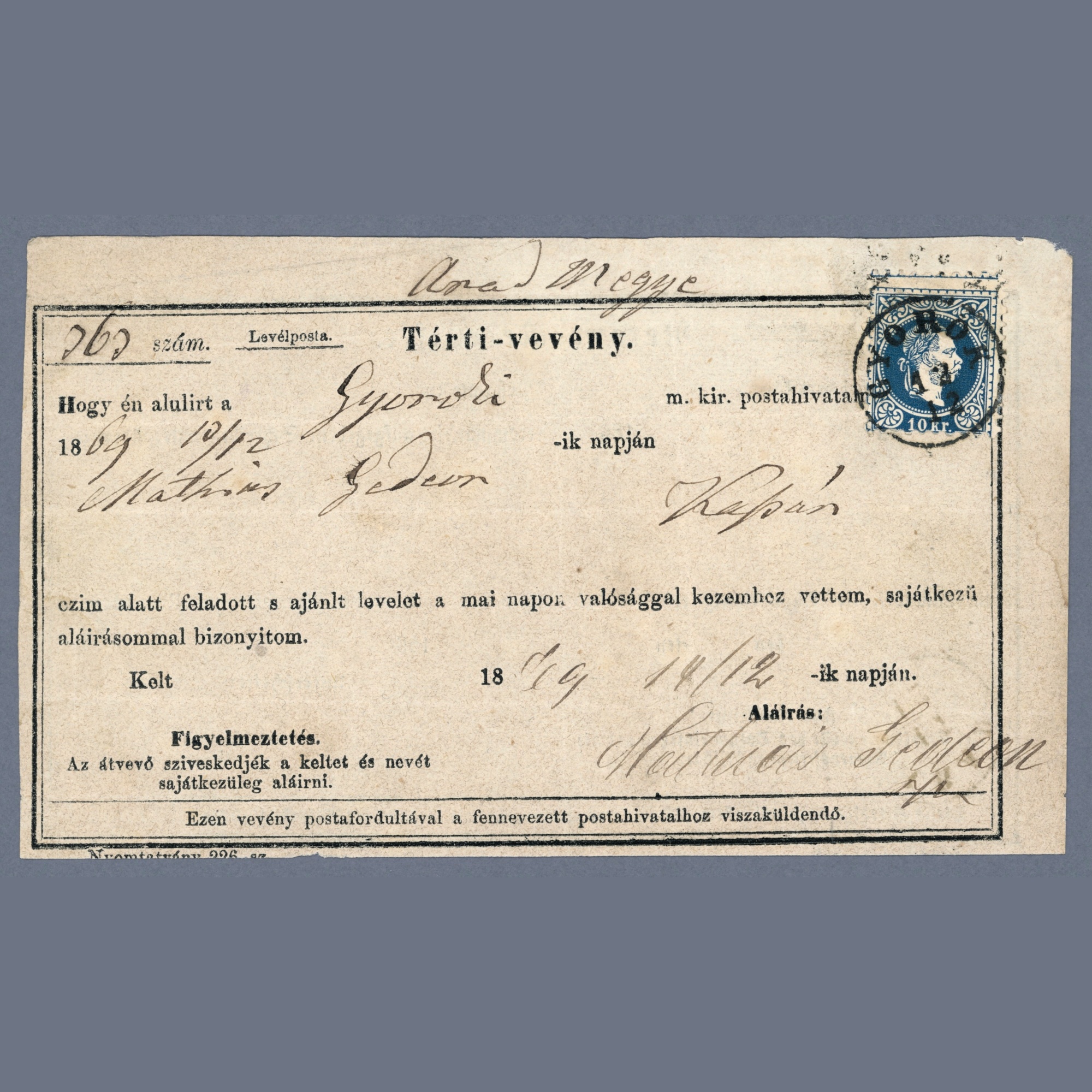 1867 Hungary – misperforated 10 krajcar stamp on return receipt, with nice GYOROK postmark | Gudlin: 150