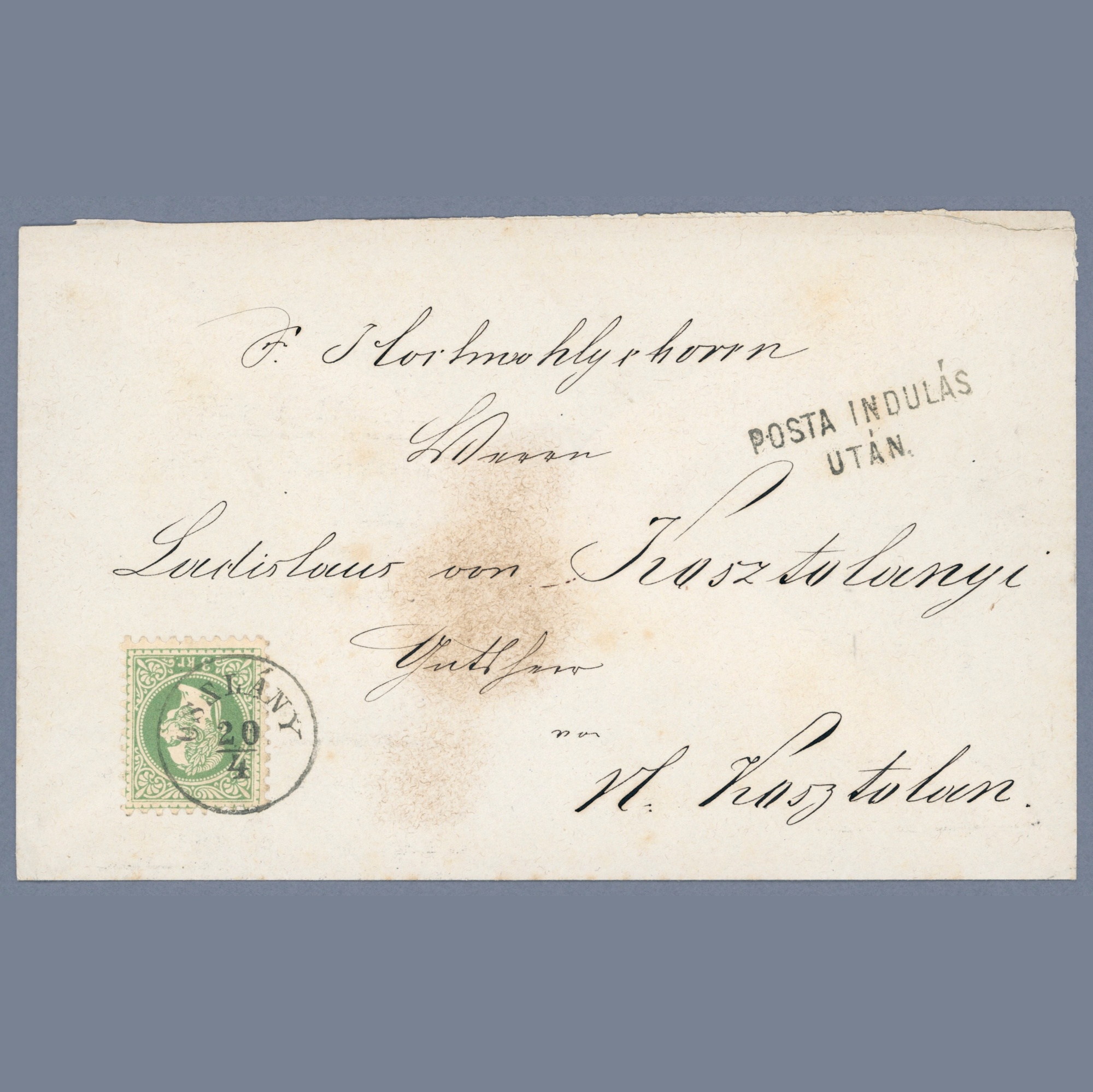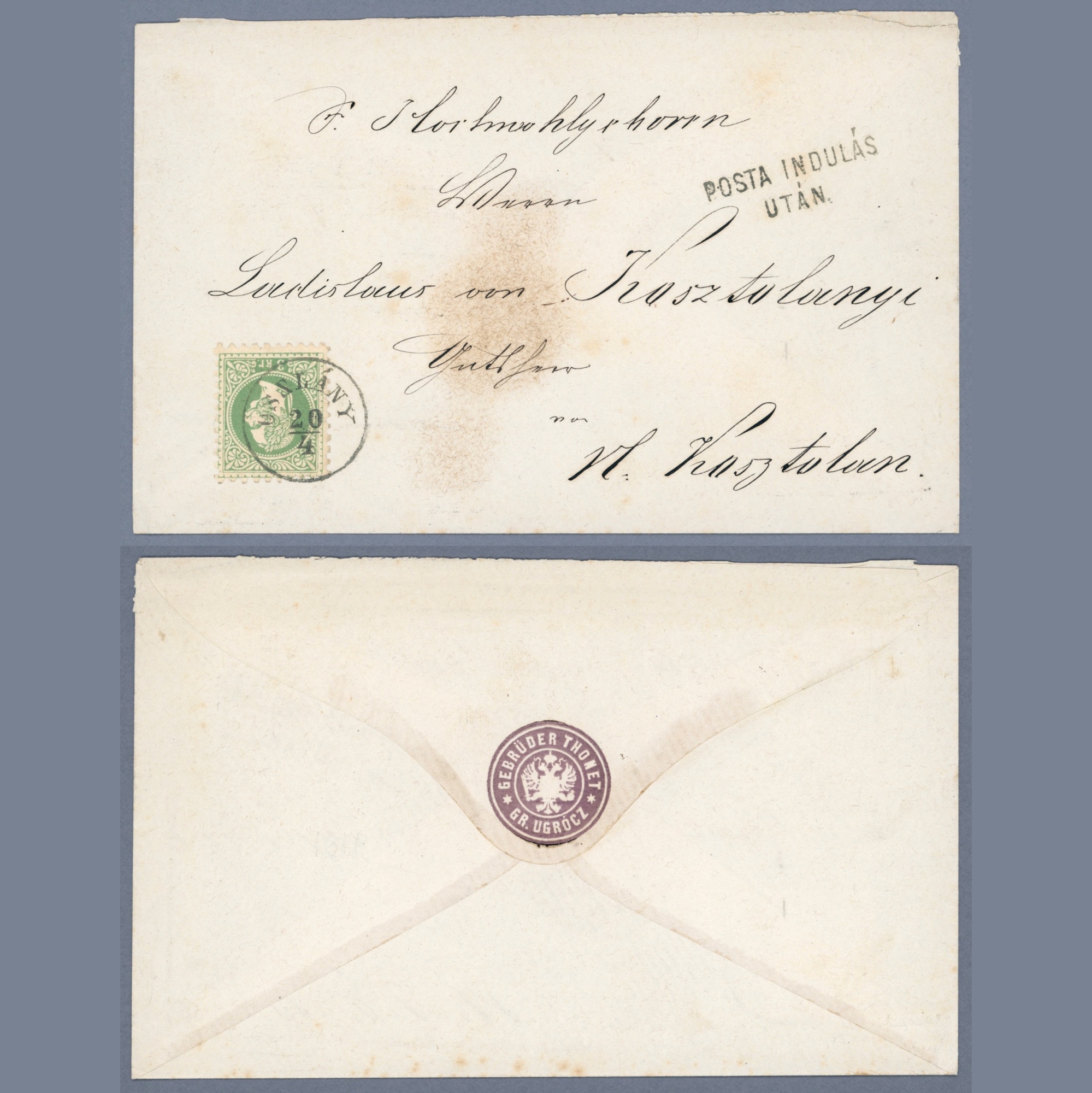 1867 Hungary – Outer area (!) mail from Oszlány to Kosztolan, addressed to Lajos Kosztolányi, on the cover of the Thonet company, with “Post after departure” postmark.