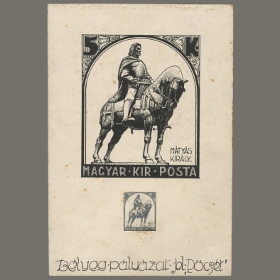 • cca. 1920 Hungary – 5 Korona stamp design + stamp-sized printing photo – design by graphic artist Zoltán Kónya
