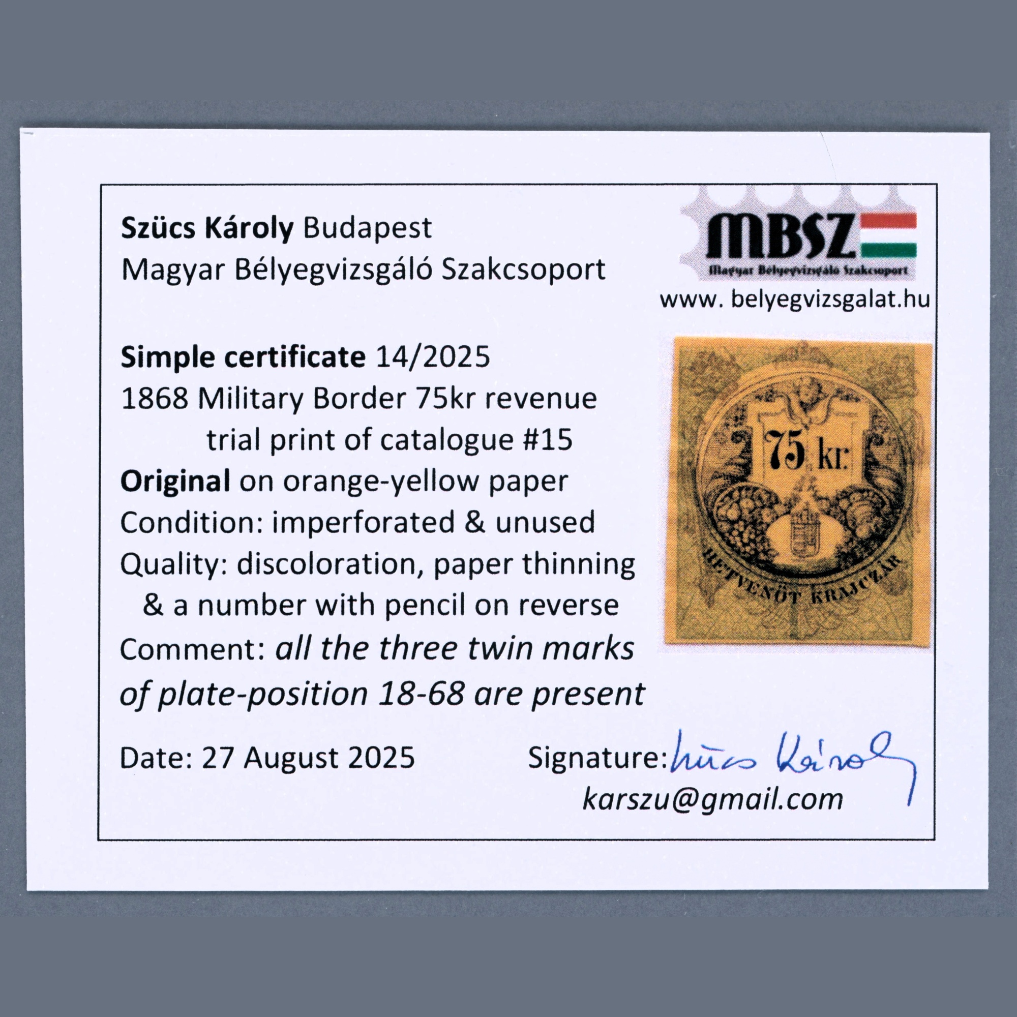 1868 Austria - Hungary - Military border documentary stamp 75 kr as proof on orange paper | Attest: Szűcs - Image 2