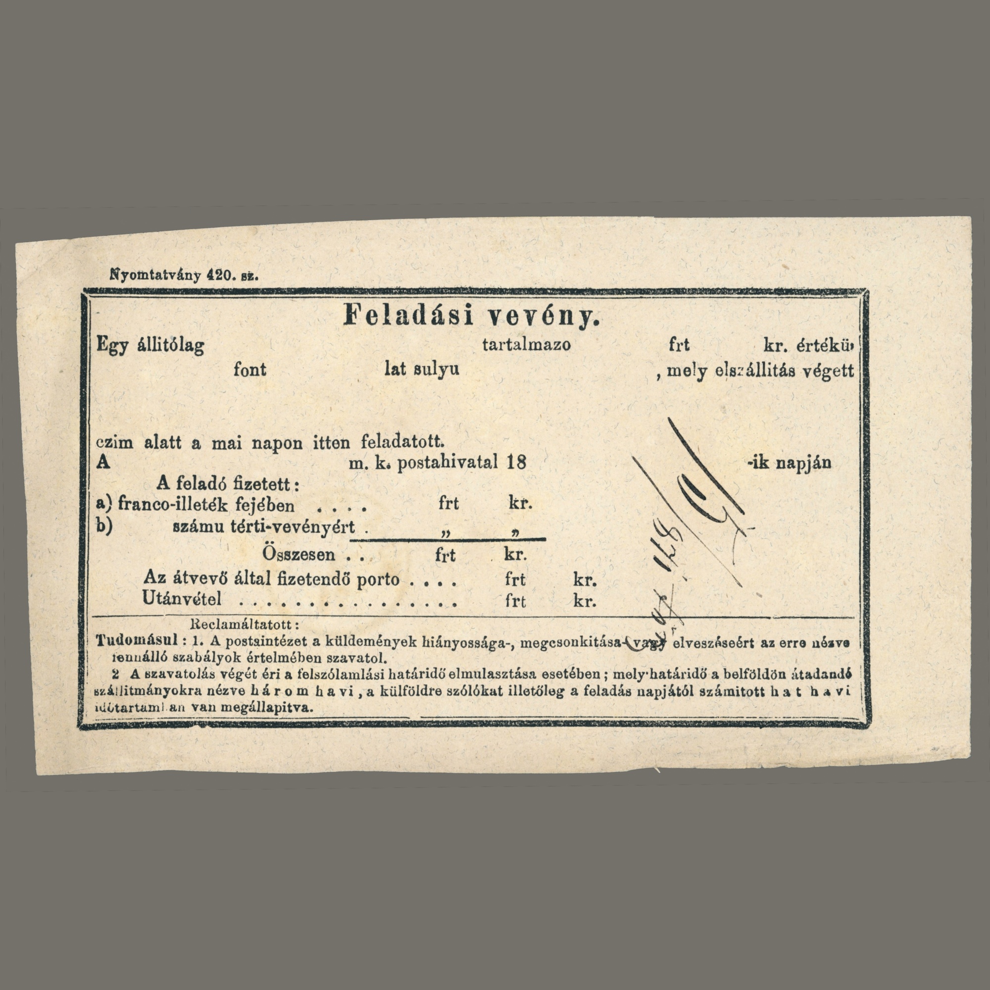 • 1894 Hungary – Parcel card for a value-insured 8 kg weight long distance (zone III) parcel sent to Timisoara. Delivered to Mr. Kálmán Takács at the theatre in Timisoara.